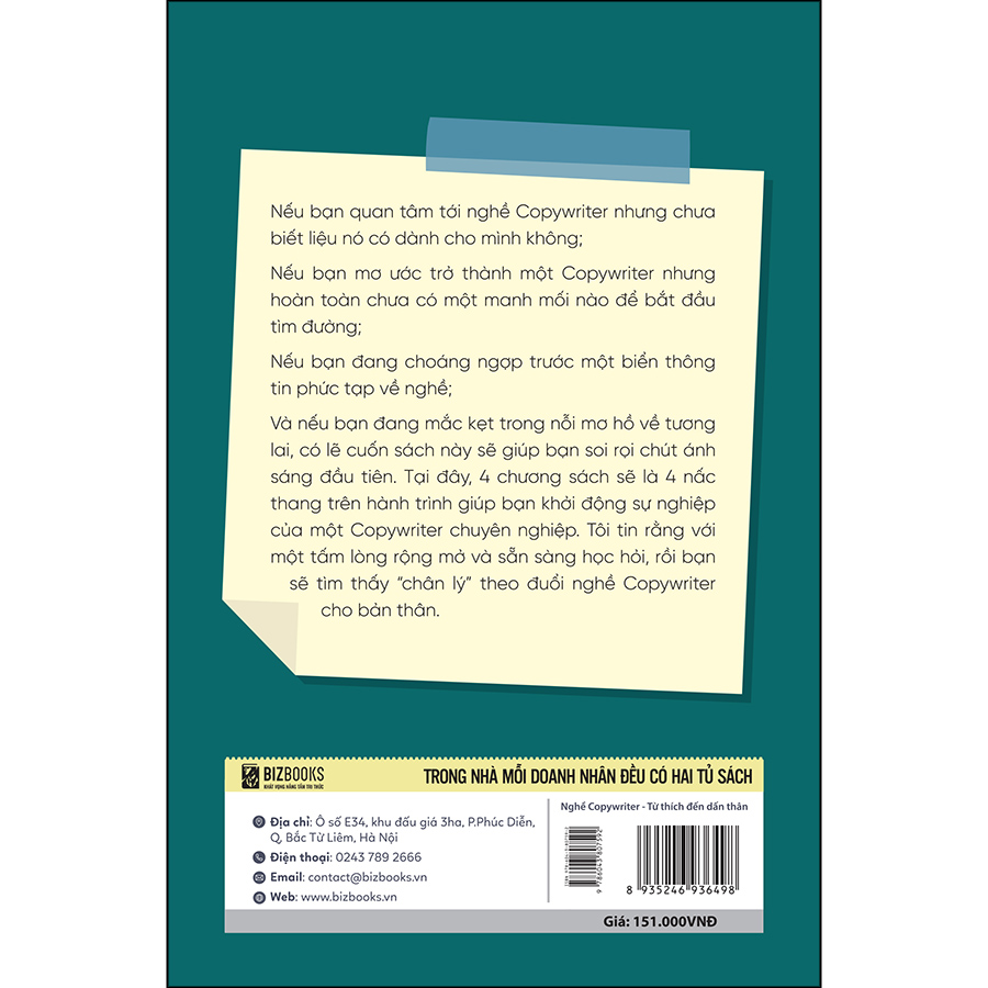 Từng trang sách sẽ đưa bạn đọc đi sâu vào từng ngõ ngách, khám phá len lỏi vào từng góc khác nhau của một ngành công nghiệp bùng nổ hiện nay. Nghề Copywriter - Từ thích đến dấn thân sẽ cũng cung cấp những chuyện được cho là “thâm cung bí sử”, những trải nghiệm làm nghề, những câu chuyện khó lí giải chỉ người trong nghề mới hiểu được. Với một tấm lòng rộng mở và sẵn sàng học hỏi, bạn sẽ tìm thấy “chân lý” theo đuổi nghề Copywriter cho bản thân, góp phần nhỏ bé giúp bạn nhìn rõ hơn con đường phía trước và có thể bắt tay vẽ tấm bản đồ của riêng mình.