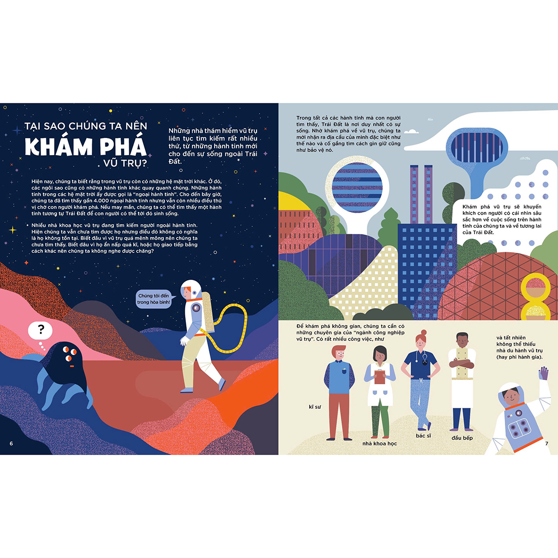 Mua tại TiktokNghề Phi hành gia Nếu độc giả nhí ấp ủ ước mơ trở thành phi hành gia thì Nghề phi hành gia chính là cuốn sách mà bạn nên đọc. Thông qua cuốn sách, bạn sẽ tìm hiểu vũ trụ là gì, tại sao chúng ta nên khám phá vũ trụ, lịch sử khám phá không gian và tình hình thám hiểm vũ trụ hiện nay. Độc giả cũng sẽ ngạc nhiên khi biết rằng để khám phá không gian, ngoài phi hành gia, chúng ta cần có những chuyên gia khác từ kĩ sư, đầu bếp cho tàu vũ trụ đến nhà khoa học tìm kiếm những hành tinh mới mà con người có thể sinh sống trong tương lai. Với các thông tin chi tiết, bổ ích được cung cấp trong cuốn sách, bạn sẽ có hiểu biết sâu sắc hơn về nghề phi hành gia và những công việc khác liên quan đến vũ trụ, từ đó, có thể quyết định theo đuổi đam mê của mình.