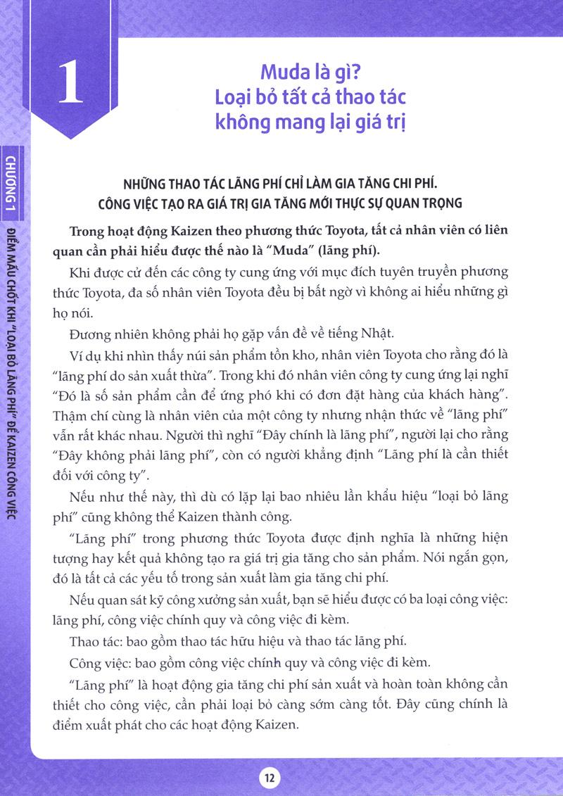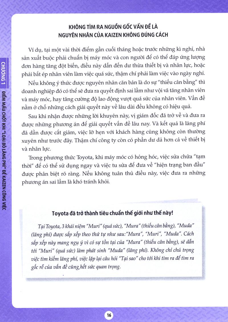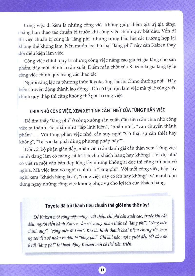 Kaizen của Toyota vốn là hệ thống được sinh ra tại nơi sản xuất nhưng đồng thời Kaizen cũng được xem là hệ thống đào tạo những con người biết suy nghĩ thông qua tạo ra những cơ hội để họ đưa ra trí tuệ. Cuốn sách này sử dụng nhiều ví dụ trong công xưởng sản xuất Toyota, nhưng nếu suy nghĩ ở khía cạnh “phương pháp tư duy” thì cuốn sách này có nhiều kinh nghiệm mà bất kỳ ai, bất kể lĩnh vực nào, thậm chí học sinh tiểu học cũng có thể áp dụng để tạo ra thành quả.