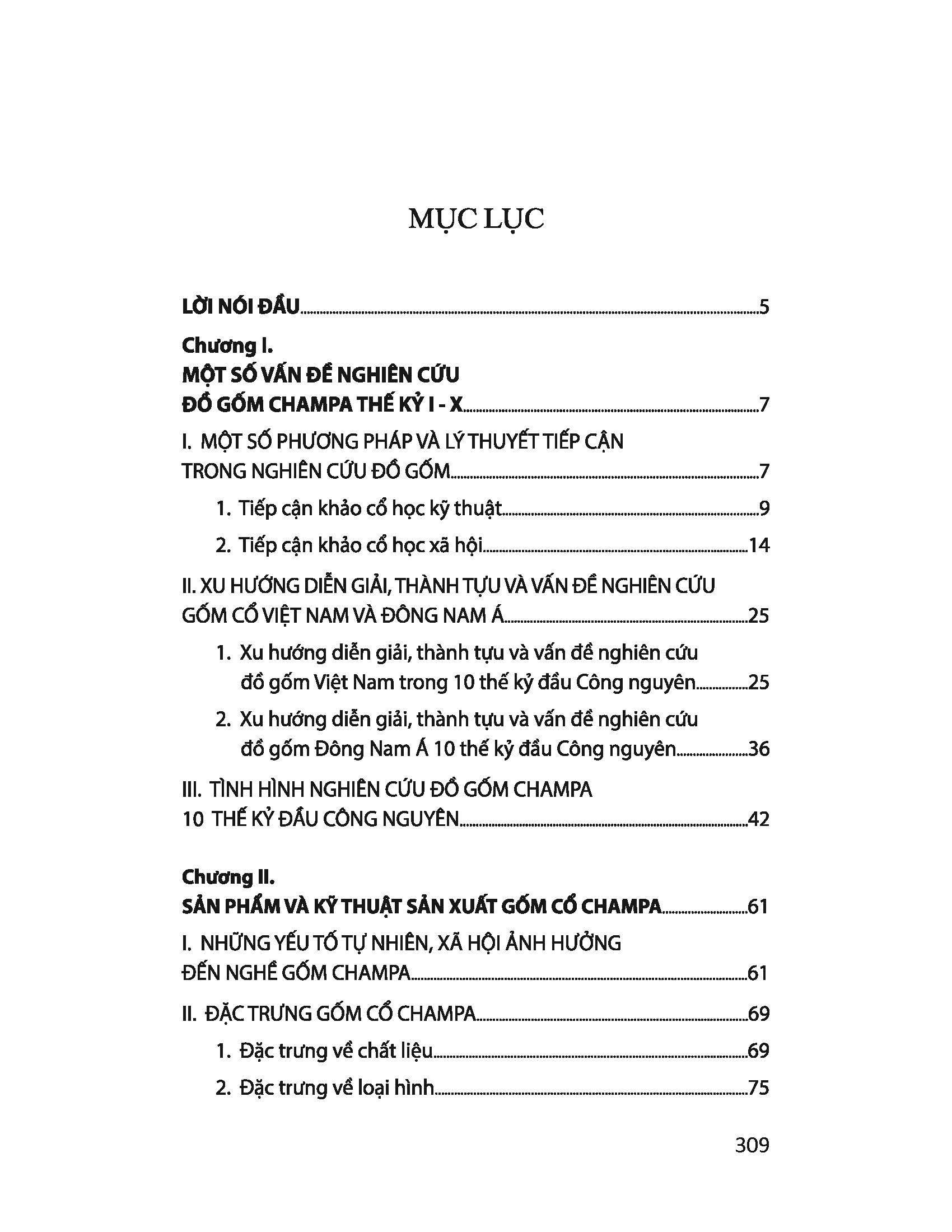 Mua tại TiktokNghiên cứu đồ gốm, nghề sản xuất gốm truyền thống của cư dân vương quốc Champa cùng việc phân tích ảnh hưởng của các mối quan hệ tiếp xúc, giao lưu văn hóa đối với sản xuất và buôn bán đồ gốm Champa trong 10 thế kỷ, làm rõ nguồn gốc, vị trí, vai trò của đồ gốm Champa, một số vấn đề liên quan đến đời sống kinh tế - xã hội của cư dân giai đoạn hình thành và phát triển nhà nước ở khu vực miền Trung Việt Nam trong suốt thiên niên kỷ I, cũng như đời sống vật chất và tinh thần của các cộng đồng dân cư Champa trong diễn trình lịch sử.