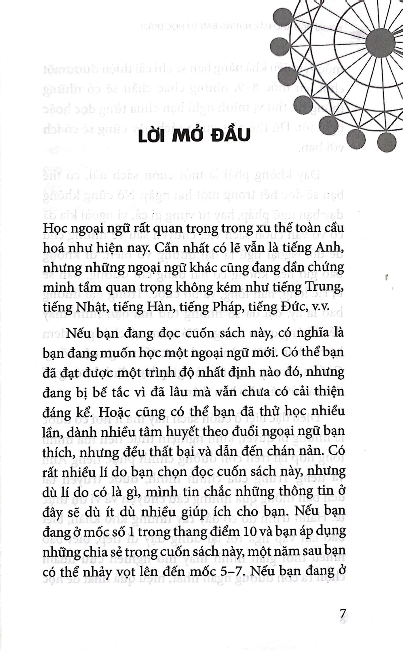 Nếu bạn đang đọc cuốn sách này, có nghĩa là bạn đang muốn học một ngoại ngữ mới. Có thể bạn đã đạt được một trình độ nhất định nào đó, nhưng đang bị bế tắc vì đã lâu mà vẫn chưa có cái thiện đáng kể. Hoặc cũng có thể bạn đã thử học nhiều lần, dành nhiều tâm huyết theo đuổi ngoại ngữ bạn thích, nhưng đều thất bại và chán nản. Có rất nhiều lí do bạn chọn đọc cuốn sách này, nhưng dù lí do có là gì, m.ình tin chắc những thông tin ở đây sẽ dù ít dù nhiều giúp ích cho bạn. Nếu bạn đang ở mốc số 1 trong thang điểm 10 và bạn áp dụng những chia sẻ trong cuốn sách này, một năm sau bạn có thể nhảy vọt lên đến mốc 5–7. Nếu bạn đang ở mốc 7, nhiều khả năng bạn sẽ chỉ cải thiện được một chút lên mốc 8–9, nhưng chắc chắn sẽ có những thông tin thú vị m.ình nghĩ bạn chưa từng đọc hoặc nghĩ tới. Dù thế nào, cuốn sách này cũng sẽ có ích với bạn.