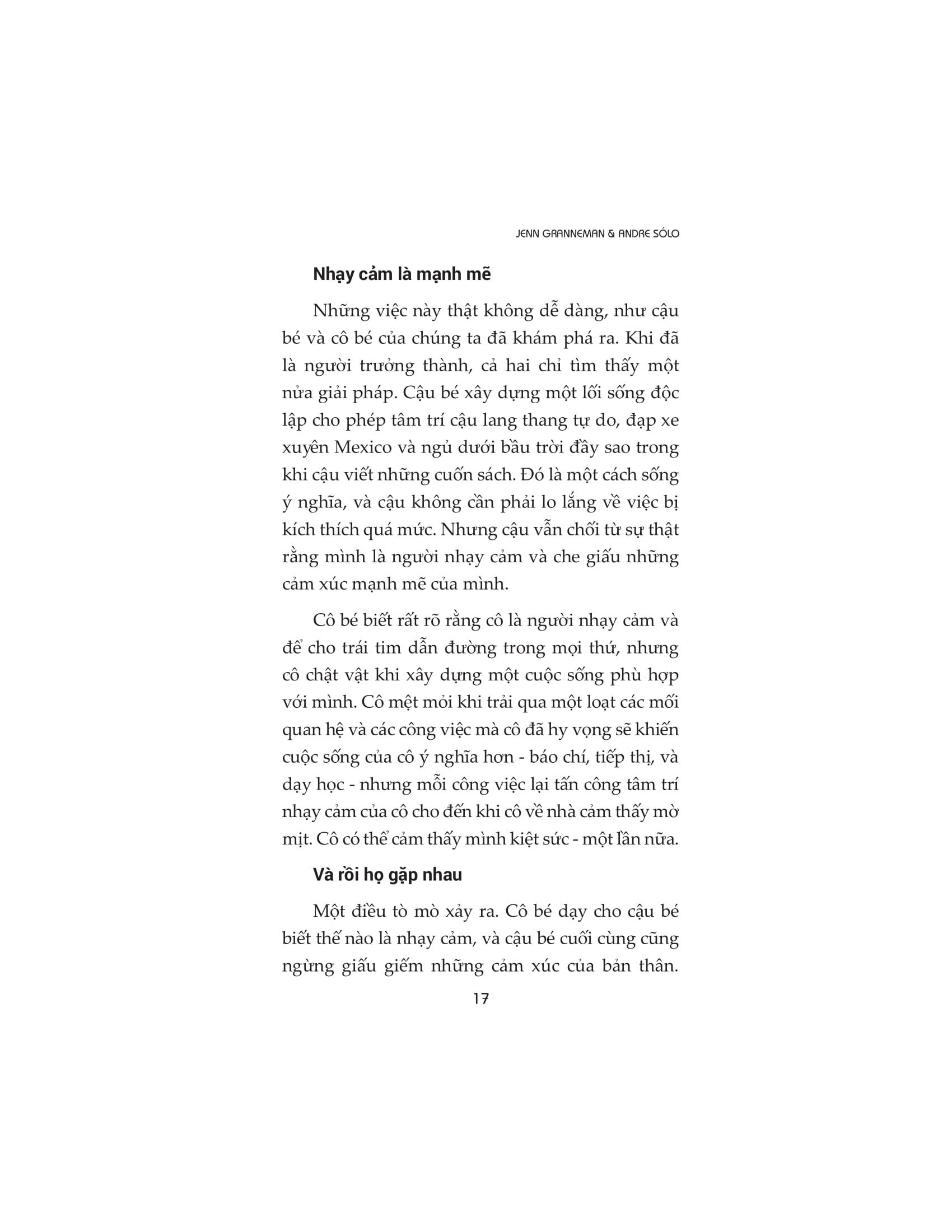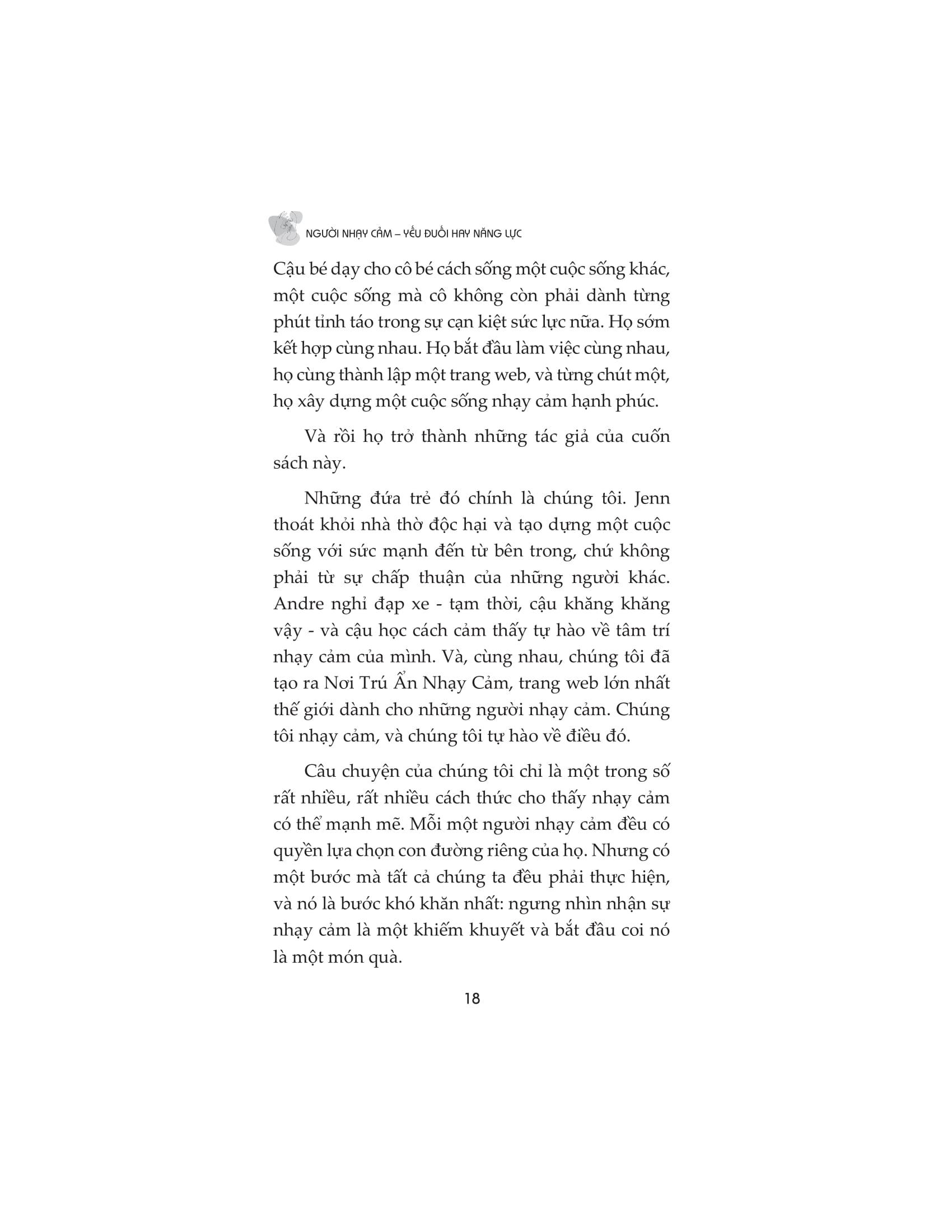 Người nhạy cảm đều có quyền lựa chọn con đường riêng của họ. Nhưng có một bước mà tất cả chúng ta đều phải thực hiện và nó là bước khó khăn nhất: ngưng nhìn nhận sự nhạy cảm là một khiếm khuyết và bắt đầu coi nó là một món quà. Cuốn sách chứa đầy cảm hứng này sẽ thay đổi mãi mãi cách chúng ta nhìn nhận những người nhạy cảm và cách họ nhìn nhận chính m.ình.
