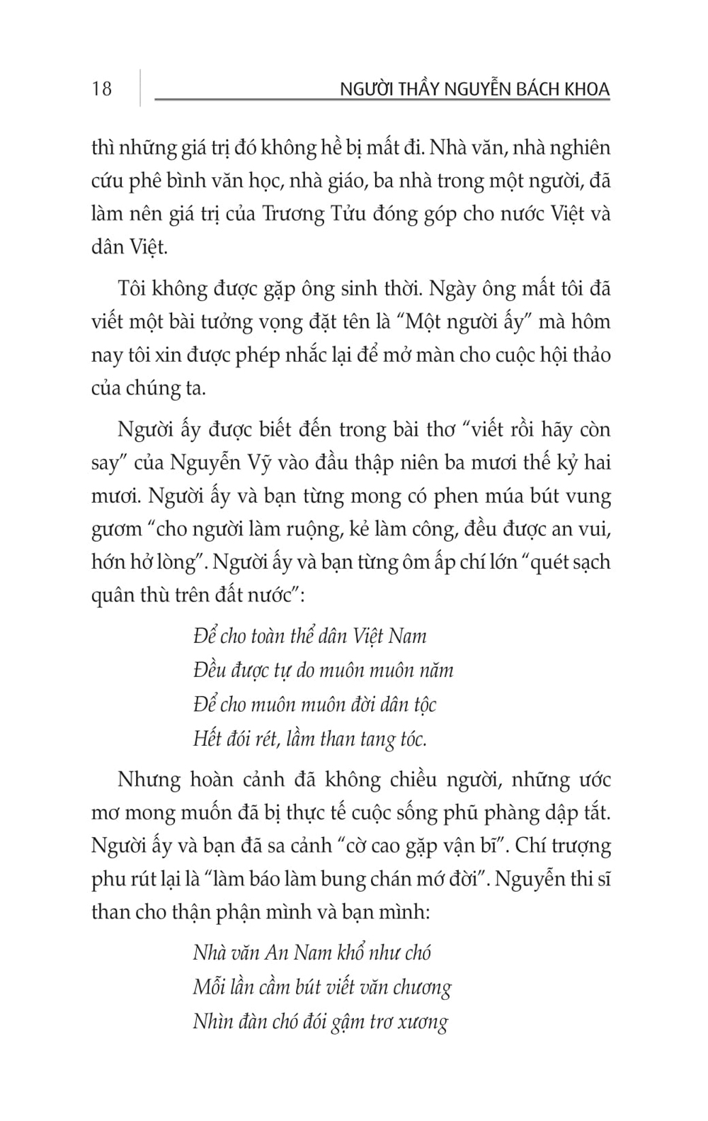 Mua tại TiktokNhà văn – Giáo sư Nguyễn Bách Khoa – Trương Tửu (1913-1999) là một trong những nhà lý luận phê bình tài ba nhất của thế hệ tiền chiến, một trong những người đi tiên phong trong lãnh vực phê bình văn học, ông còn sáng tác một loạt tiểu thuyết. Người thầy Nguyễn Bách Khoa là những trang viết về cuộc đời và sự nghiệp, những nghiên cứu học thuật và sáng tác, những hồi ức, kỷ niệm về ông…