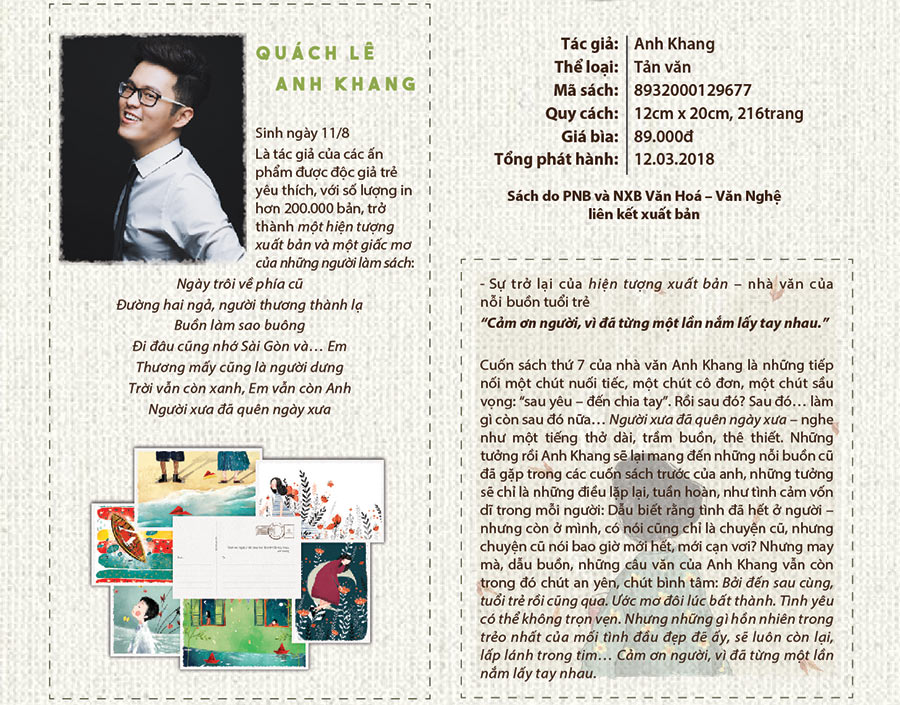 Cuốn sách thứ 7 của nhà văn Anh Khang là những tiếp nối một chút nuối tiếc, một chút cô đơn, một chút sầu vọng: “sau yêu – đến chia tay”. Rồi sau đó? Sau đó… làm gì còn sau đó nữa… Người xưa đã quên ngày xưa – nghe như một tiếng thở dài, trầm buồn, thê thiết. Những tưởng rồi Anh Khang sẽ lại mang đến những nỗi buồn cũ đã gặp trong các cuốn sách trước của anh, những tưởng sẽ chỉ là những điều lặp lại, tuần hoàn, như tình cảm vốn dĩ trong mỗi người: Dẫu biết rằng tình đã hết ở người – nhưng còn ở mình, có nói cũng chỉ là chuyện cũ, nhưng chuyện cũ nói bao giờ mới hết, mới cạn vơi? Nhưng may mà, dẫu buồn, những câu văn của Anh Khang vẫn còn trong đó chút an yên, chút bình tâm: Bởi đến sau cùng, tuổi trẻ rồi cũng qua. Ước mơ đôi lúc bất thành. Tình yêu có thể không trọn vẹn. Nhưng những gì hồn nhiên trong trẻo nhất của mối tình đầu đẹp đẽ ấy, sẽ luôn còn lại, lấp lánh trong tim… Cảm ơn người, vì đã từng một lần nắm lấy tay nhau.