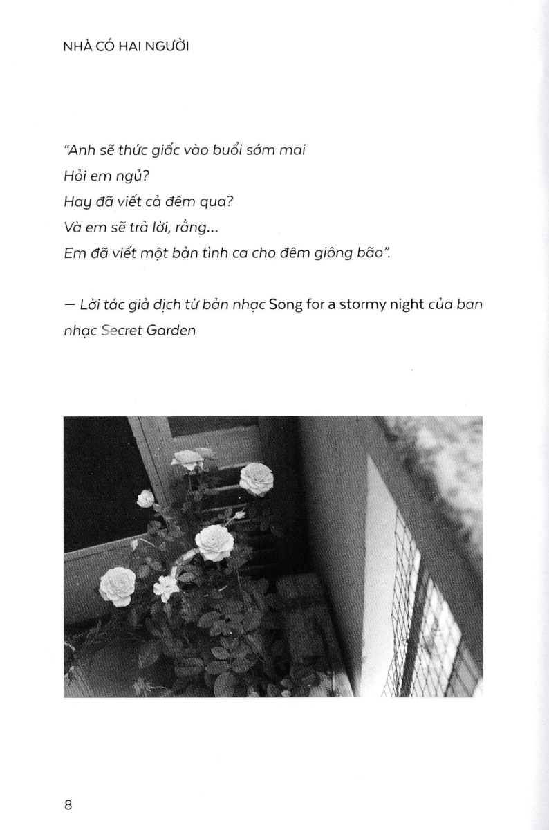 Trong Nhà Có Hai Người, bạn có thể sẽ tìm thấy mình, trong một giai đoạn nào đó của cuộc đời. Mải miết yêu một người, đồng hành cùng nhau trưởng thành, nắm tay nhau đi qua những giai đoạn khó khăn của cuộc đời. Và rồi bạn nhận ra: Trong tình yêu không cần sự hy sinh, mà chỉ đơn giản là cho đi những điều tốt đẹp. Chúng ta bước vào tình yêu không phải để được lấp đầy, mà chúng ta cần lấp đầy chính mình trước khi yêu thương ai đó.