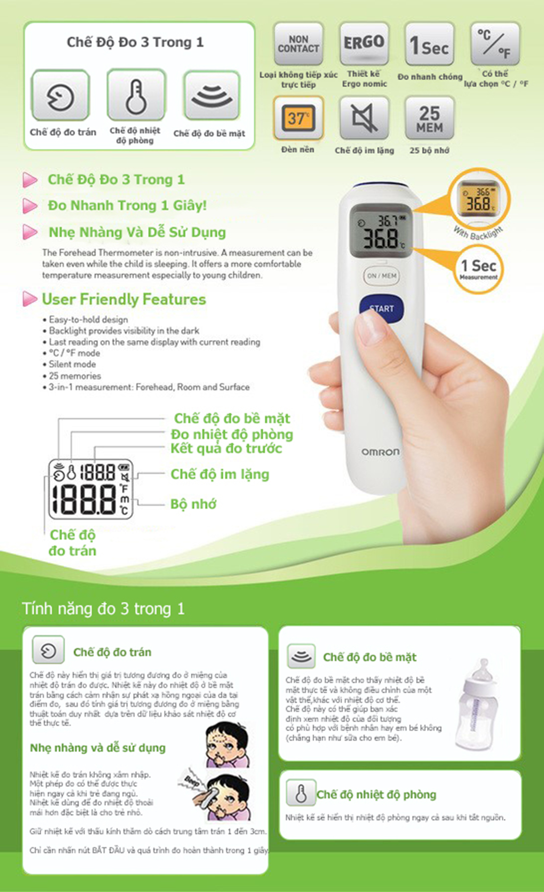 Công nghệ đo hồng ngoại mà không tiếp xúc với da, để đo sốt hợp vệ sinh và an toàn, đặc biệt thích hợp cho trẻ sơ sinh và trẻ mới biết đi Sử dụng
