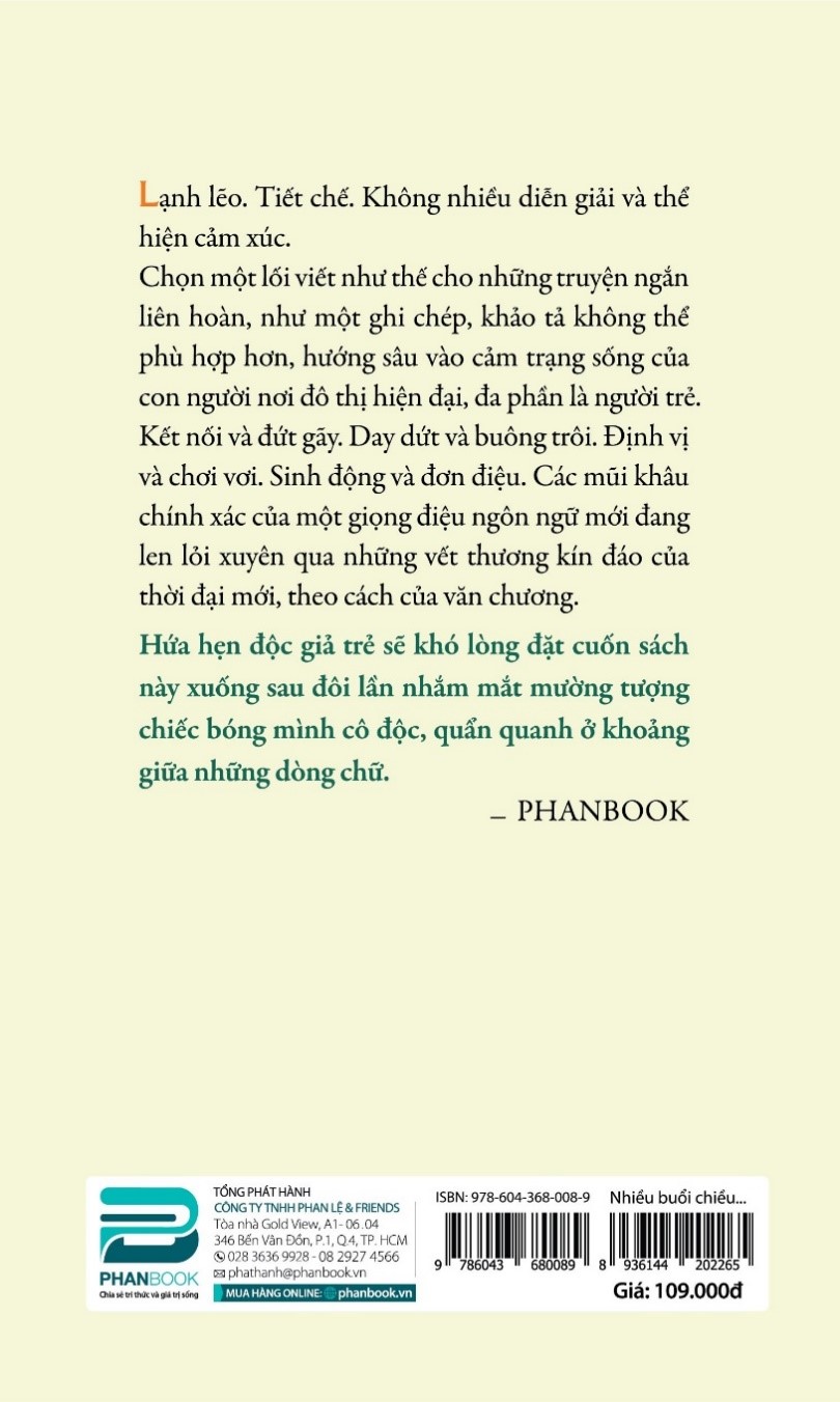 Hứa hẹn đọc giả trẻ sẽ khó lòng đặt cuốn sách này xuống sau đôi lần nhắm mắt mường tượng chiếc bóng mình cô độc, quẩn quanh ở khoảng giữa những dòng chữ.há là không thể phù hợp hơn, hướng sâu vào cảm trạng sống của con người nơi đó thời hiện đại, đa phần là người trẻ. Kết nối và đứt gãy. Đây đứt và buông trôi. Định vị và chơi vơi. Sinh động và đơn điệu. Các mũi khâu chính xác của một giọng điệu ngôn ngữ mới đang len lỏi xuyên qua những vết thương kín đáo của thời đại mới, theo cách của văn chương.