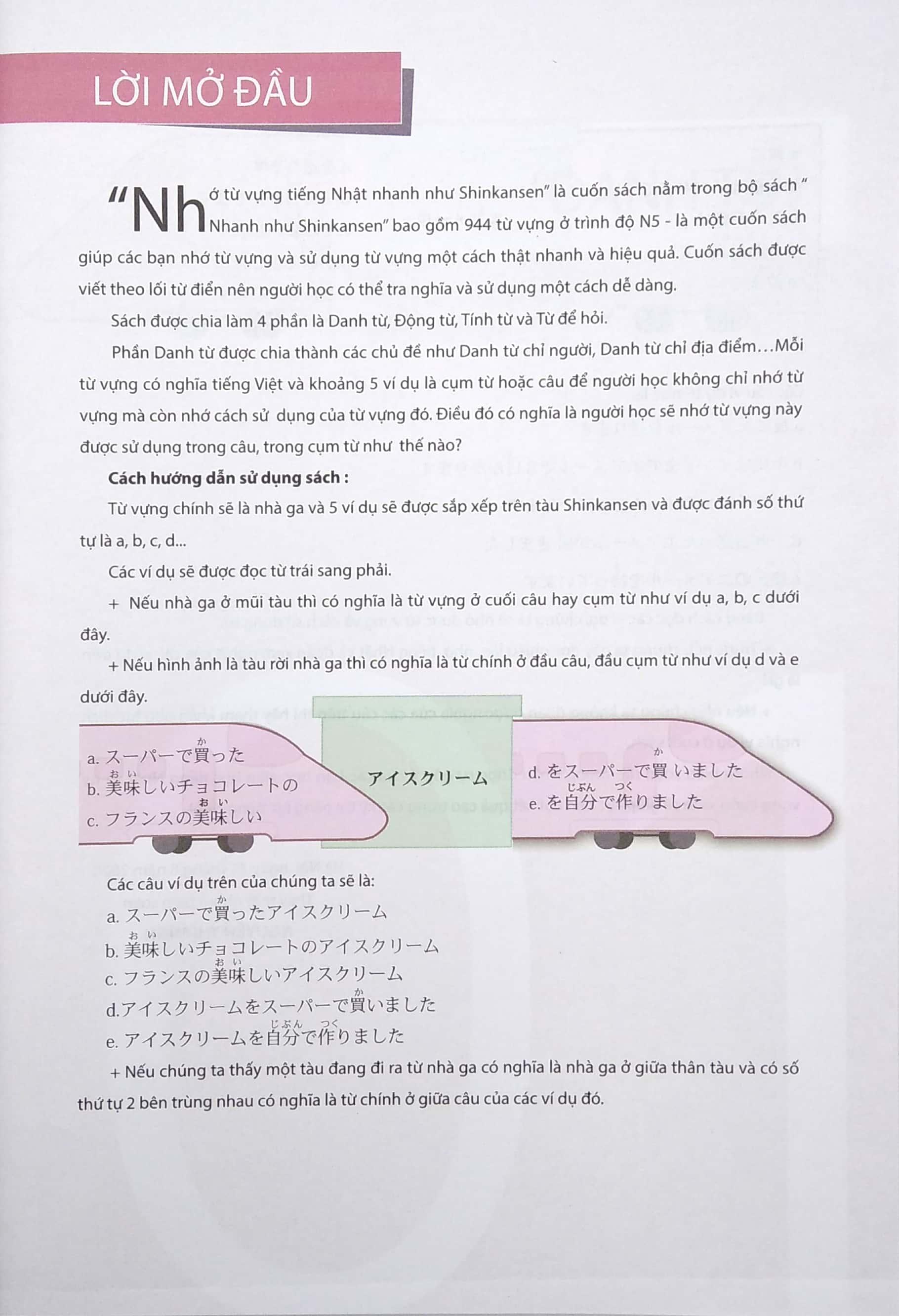 Nhớ từ vựng nhanh như Shinkanzen là cuốn sách nằm trong bộ sách “Nhanh như shinkanzen” bao gồm 944 từ vựng ở trình độ N5. Được biên soạn với hình thức tương tự như 1 cuốn từ điển Nhớ từ vựng tiếng Nhật nhanh như Shinkansen giúp người học có thể tra nghĩa và cách sử dụng vô cùng nhanh chóng, dễ dàng.