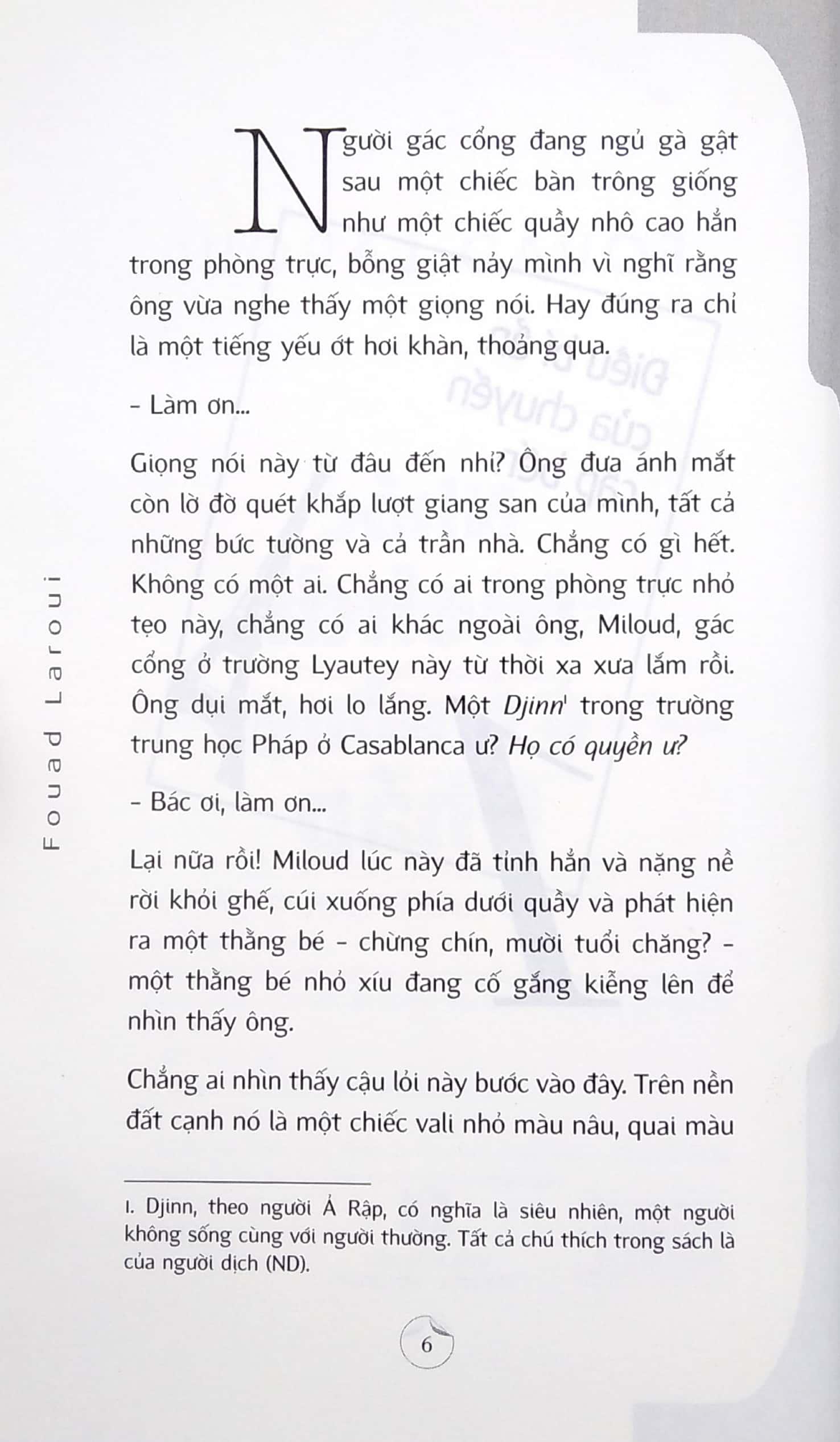 Miloud cúi xuống phía dưới quầy và phát hiện ra một thằng bé - chừng chín, mười tuổi chăng? - một thằng bé nhỏ xíu đang cố gắng kiễng lên để nhìn thấy ô Trên nền đất cạnh nó là một chiếc vali nhỏ màu nâu, quai màu trắng hơi nhô lên, như đang đứng đợi xem những sự kiện tiếp theo sẽ diễn ra. Miloud, với một trí thông minh tuyệt đỉnh đã cho rằng cậu lỏi này hẳn là một học sinh nội trú Người đàn ông và đứa trẻ ngắm nhìn nhau, quan sát nhau, người này ngạc nhiên, kẻ kia lại gần như lo sợ, cứ chiếu theo bộ mặt ốm yếu của nó thì biết, trên đó gắn cặp mắt to đang kêu gào trợ giúp. Thì cũng có cái để mà hoảng loạn đấy chứ: bản mặt đỏ bừng đang cúi về phía nó, cặp mắt gườm gườm, nửa miệng đã trơ lợi, giống hệt như miệng của Pat Hibulaire - con mèo đen to tướng với dáng vẻ tàn ác khiến ai nấy đều kinh hồn trong phim Mickey. Con mèo Pat Hibulaire ấy, nó làm cái khỉ gì trong trường trung học Lyautey nhỉ?