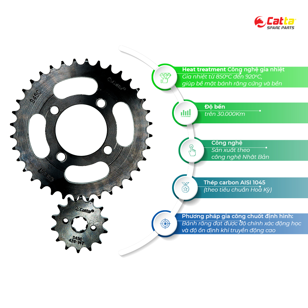 Nhông sên dĩa Wave 125 (bộ nhông xích Wave 125) thương hiệu CATTA Spare Parts được sản xuất từ thép carbon S45C chuyên dụng trong ngành công nghiệp nhông sên dĩa. Do đó, sản phẩm đạt chất lượng cao về độ cứng, độ bền, khả năng chịu tải trọng lớn, đạt tiêu chuẩn quốc tế dành cho các sản phẩm truyền động.