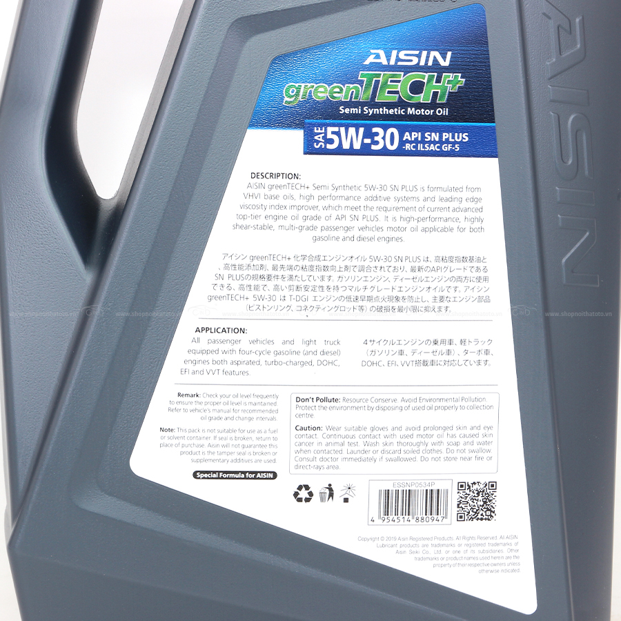 Giới thiệu Nhớt động cơ AISIN ESSN0354P 5W-30 SN PLUS greenTECH+ Semi Synthetic 4L