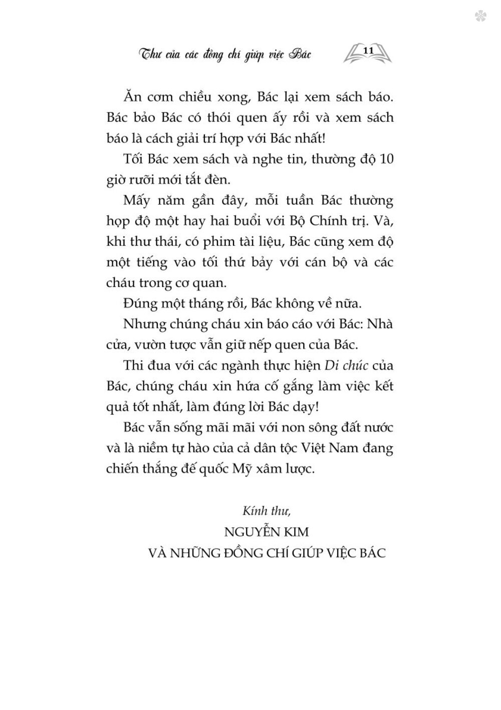 Mua tại TiktokCuốn sách Những bức thư kể chuyện Bác Hồ tập hợp những bức thư được đăng trên báo Nhân Dân từ năm 1969 đến năm 1984 của đồng chí Vũ Kỳ người thư ký tận tụy, người cộng sự gần gũi, người từng có vinh dự nhiều năm liền được sống và làm việc bên Bác Hồ kính yêu. Cuốn sách như những dòng hồi tưởng liền mạch, nơi mỗi câu chuyện được kể bằng giọng văn khiêm nhường, giản dị. Từ một góc nhìn gần gũi hiếm thấy, những hình ảnh đời thường của Bác Hồ hiện lên rất đỗi thân thương.