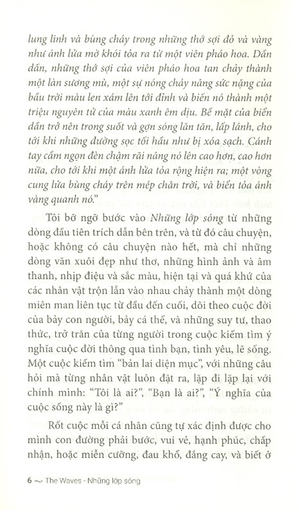 "Những lớp sóng" của Virginia Woolf là triều dâng của đời sống, triều dâng của một thứ ngôn từ nghệ thuật ngoại hạng mà dường như chỉ có một thiên tài như nàng, người tạo ra những bước sóng lạ thường trong văn chương thế kỷ hai mươi.