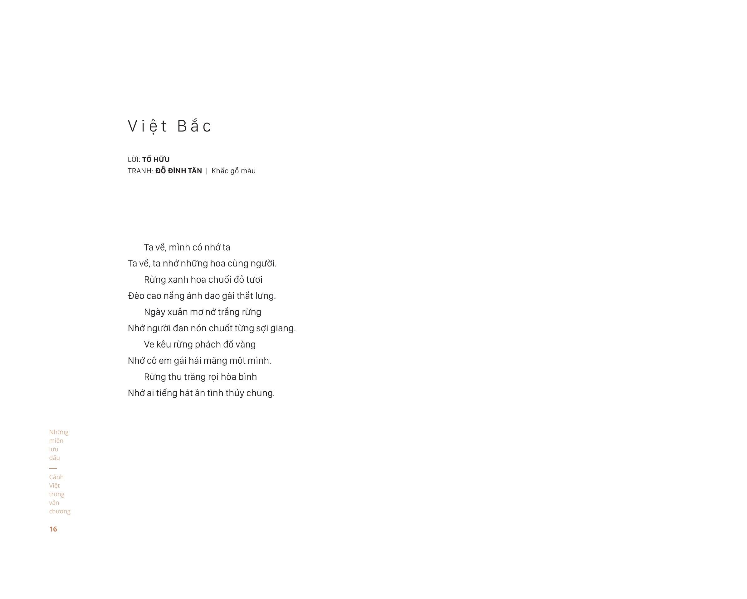 Bắt đầu từ những đoạn trích trong sách giáo khoa phổ thông đã trở nên quen thuộc với nhiều thế hệ, nhóm biên soạn cũng đưa vào những vần thơ, áng văn viết về các nơi chốn khác. Một phần, chúng tôi mong muốn tấm bản đồ cảnh sắc quê hương từ ngôn từ và tranh trong cuốn sách này thêm phong phú và rực rỡ, đồng thời, cuốn sách này cũng có thể được sử dụng như tư liệu dạy và học – một gợi ý giúp các giáo viên và học sinh tiếp cận tác phẩm văn học trong chương trình phổ thông trong sự giao thoa với các hình thức nghệ thuật khác.
