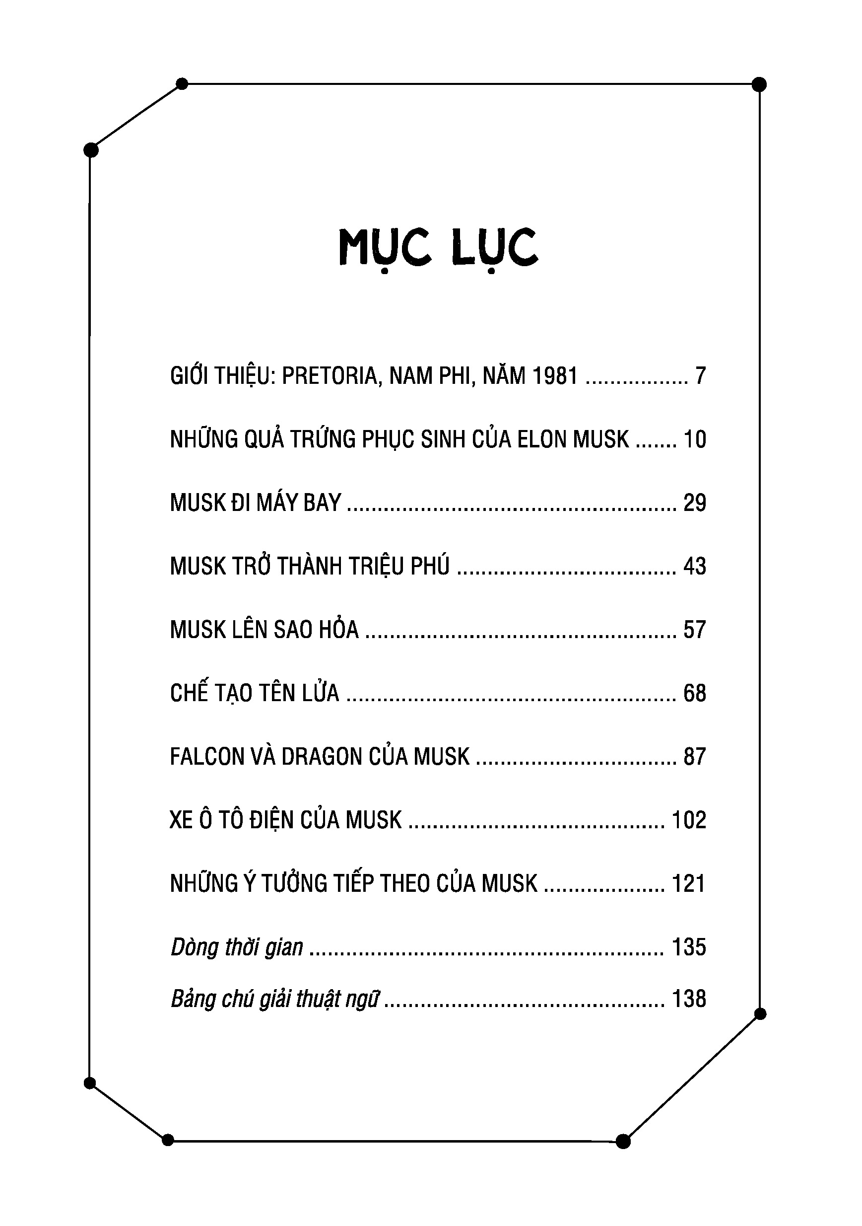 Cuốn sách không chỉ kể về những thành tựu của Elon Musk mà còn hé lộ cho chúng ta rất nhiều điều thú vị về vị tỷ phú doanh nhân có ước muốn chế tạo ra tên lửa vũ trụ mạnh nhất thế giới, từ những câu chuyện vui mang tính riêng tư như: Elon Musk thích tiệc tùng đến mức nào? đến những vấn đề vĩ mô hơn như: Vì sao ông lại muốn đưa con người lên Sao Hỏa? Cho đến vấn đề cốt lõi: Điều gì khiến Elon Musk say mê nghiên cứu khoa học đến vậy?