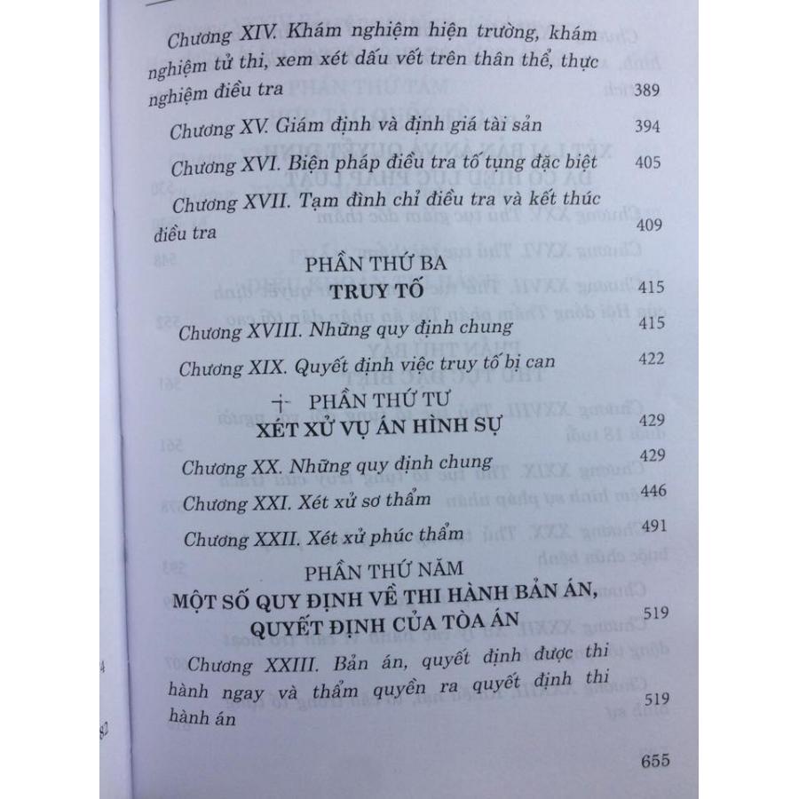 Cuốn sách gồm 9 phần, 510 điều, quy định trình tự, thủ tục tiếp nhận, giải quyết nguồn tin về tội phạm, khởi tố, điều tra, truy tố, xét xử và một số thủ tục
