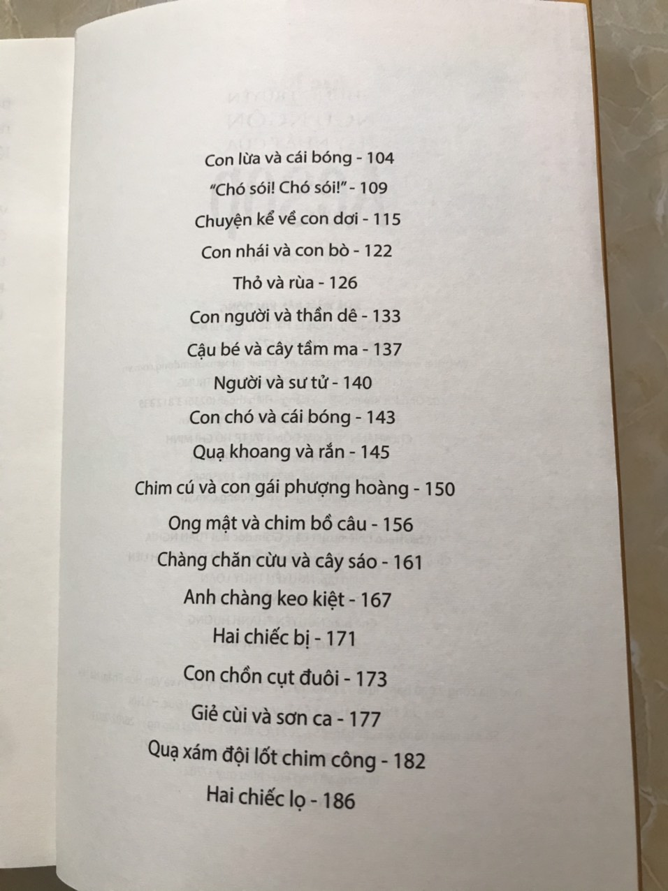 Có một chú bé chăn cừu nhút nhát kêu “Chó sói! Chó sói!”. Một con cáo giỏi chê “Chùm nho xanh!”. Có con ngỗng đẻ trứng vàng và cuộc thi giữa rùa và thỏ. Rồi chuyện tình bạn giữa ong mật và chim bồ câu, chuyện anh chàng keo kiệt; kho báu của người cha để lại…