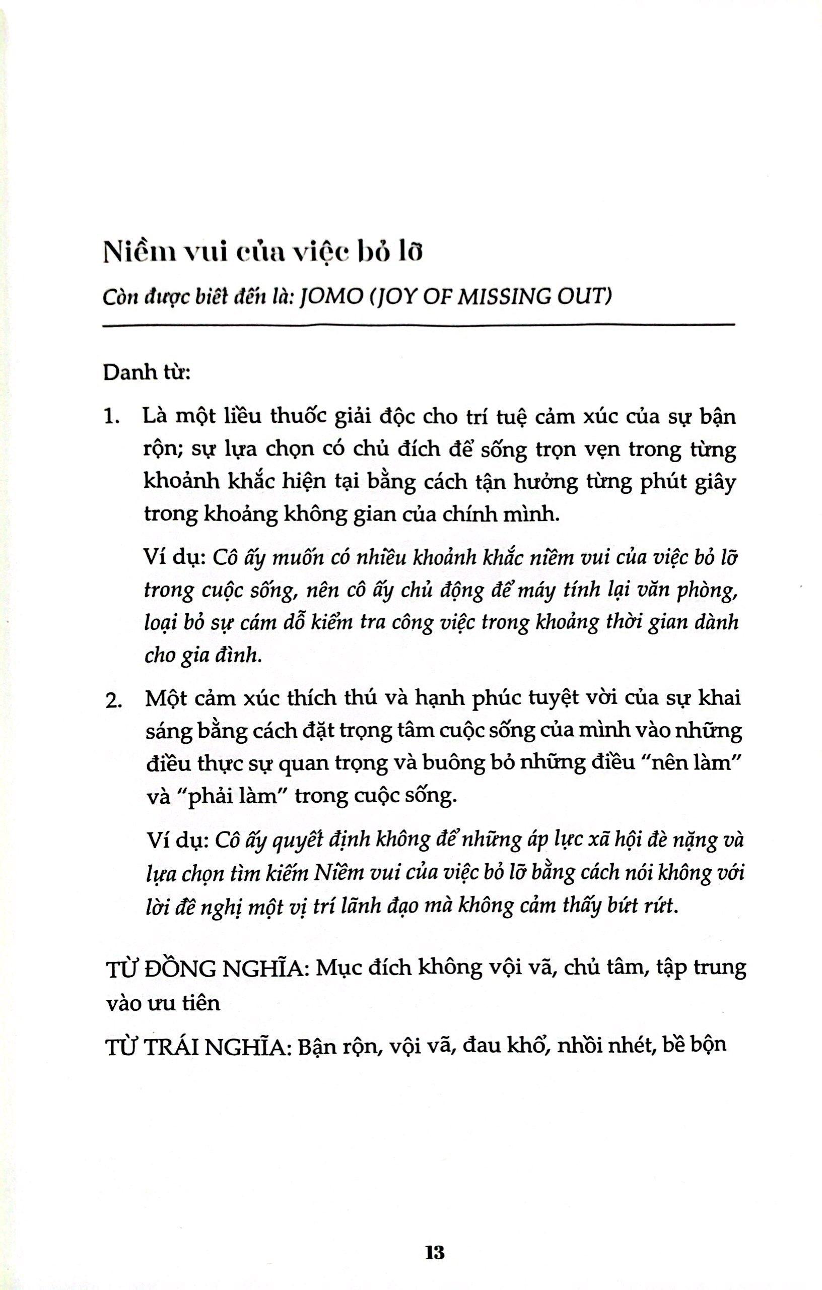 Sống năng suất không có nghĩa là làm nhiều hơn. Sống năng suất là làm những điều quan trọng nhất. Bạn có thể định nghĩa được khái niệm “đủ” trong cuộc sống của mình? Những cuốn sách về hạnh phúc, về cân bằng cuộc sống hay tối giản tâm trí – của cải đã không còn xa lạ với chúng ta. Nhưng NIỀM VUI CỦA VIỆC BỎ LỠ mang đến cho chúng ta một góc nhìn hoàn toàn mới: đánh giá lại cuộc sống trong mỗi ngày của mình để hiểu được chúng ta đã và đang hối tiếc điều gì, đâu mới là năng suất thực sự của bản thân. Thời gian là hữu hạn và mong muốn của chúng ta là vô hạn. Vậy làm như thế nào để cân bằng giữa thời gian và mong muốn? Phương pháp liveWELL Method của tác giả Tanya Dalton sẽ giúp bạn có câu trả lời, để những tính từ “bận rộn”, “choáng ngợp” không còn dùng để miêu tả mỗi ngày của bạn nữa, để bạn hiểu như thế nào là “đủ”. Từng chương sách trong NIỀM VUI CỦA VIỆC BỎ LỠ như một cách cửa sổ giúp chúng ta đón nhận những tia nắng sớm mai rực rỡ soi chiếu tâm hồn và để gió cuốn đi những suy nghĩ tiêu cực, những bộn bề lo toan không cần thiết. Một cuốn sách hay có lẽ chỉ cần có vậy.