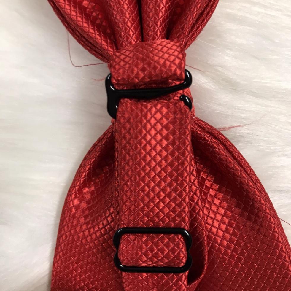 Thông tin sản phẩm Chất liệu gồm 1. Vải Silk Lụa 100% 2. Miếng lót bên trong là vải không dệt, from cứng 3. Dây đeo có móc cài nhựa Kích thước nơ đeo cổ
