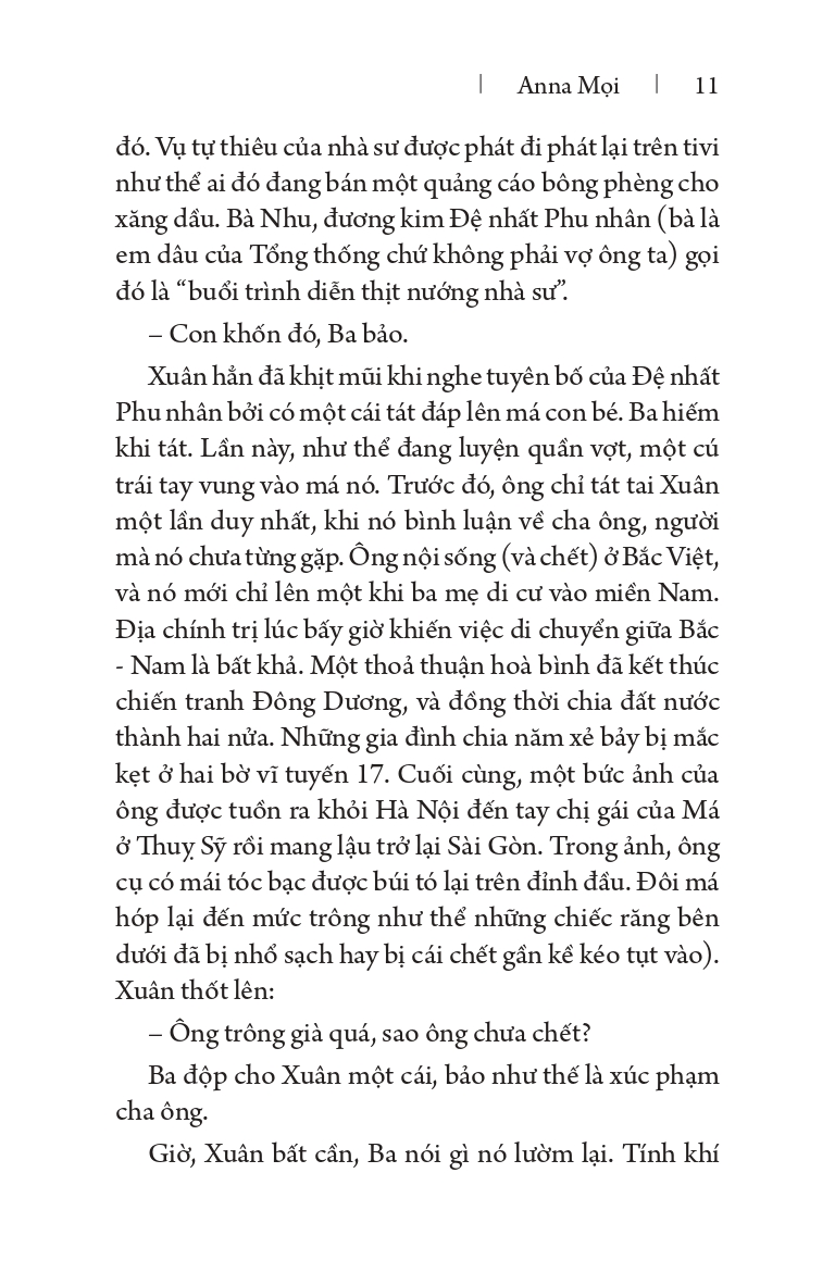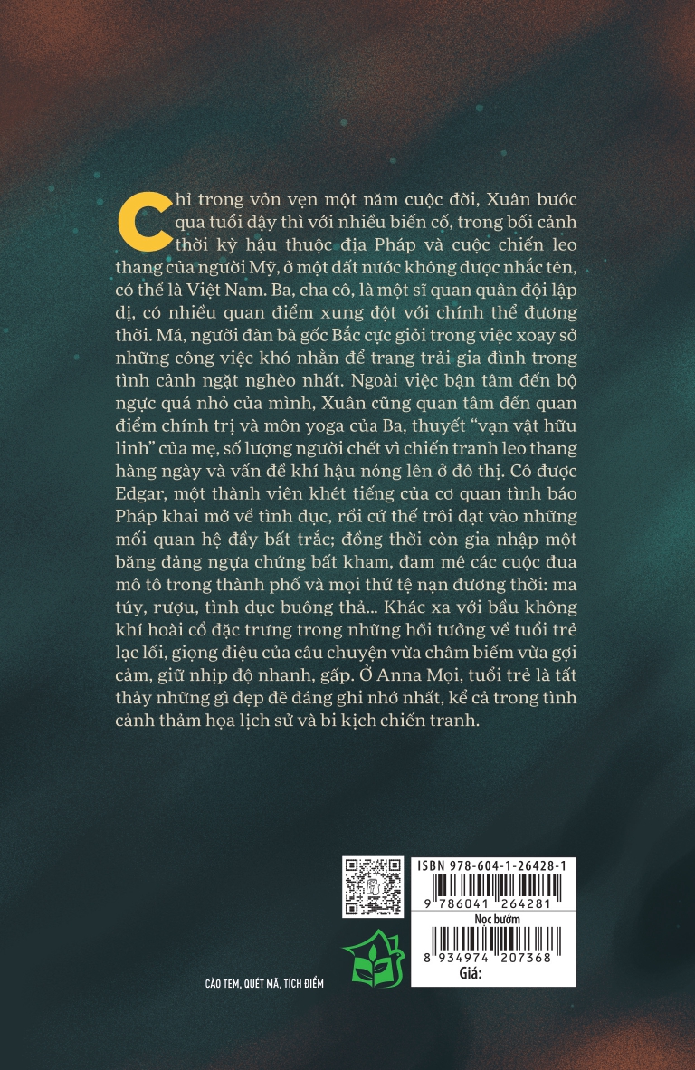 Trong vỏn vẹn một năm cuộc đời, Xuân bước qua tuổi thiếu niên và kết thúc nhanh chóng, trong bối cảnh thời kỳ hậu thuộc địa Pháp và cuộc chiến của người Mỹ, ở một đất nước không tên có thể là Việt Nam. Ba, cha cô, là một sĩ quan quân đội lập dị. Mẹ cô, người đàn bà xoay sở những công việc khó nhằn nhất thời ấy để kiếm sống. Ngoài việc bận tâm đến bộ ngực quá nhỏ của mình, Xuân cũng quan tâm đến quan điểm chính trị và yoga của Ba, thuyết “vạn vật hữu linh” của mẹ, số lượng người chết vì chiến tranh hàng ngày và vấn đề khí hậu nóng lên ở đô thị. Cô được Edgar, một thành viên khét tiếng của cơ quan tình báo Pháp khai mở về tình dục, và gia nhập một băng đảng bất kham, đam mê các cuộc đua mô tô trong thành phố và mọi thứ tệ nạn đương thời: ma tú, rượu, tình dục buông thả. Khác xa với bầu không khí hoài cổ đặc trưng trong những hồi tưởng về tuổi trẻ lạc lối, giọng điệu của câu chuyện vừa châm biếm vừa gợi cảm, nhịp độ nhanh, gấp. Ở Anna Moï, tuổi trẻ là tất cả những gì tốt đẹp, kể cả trong tình cảnh thảm họa lịch sử và bi kịch chiến tranh.