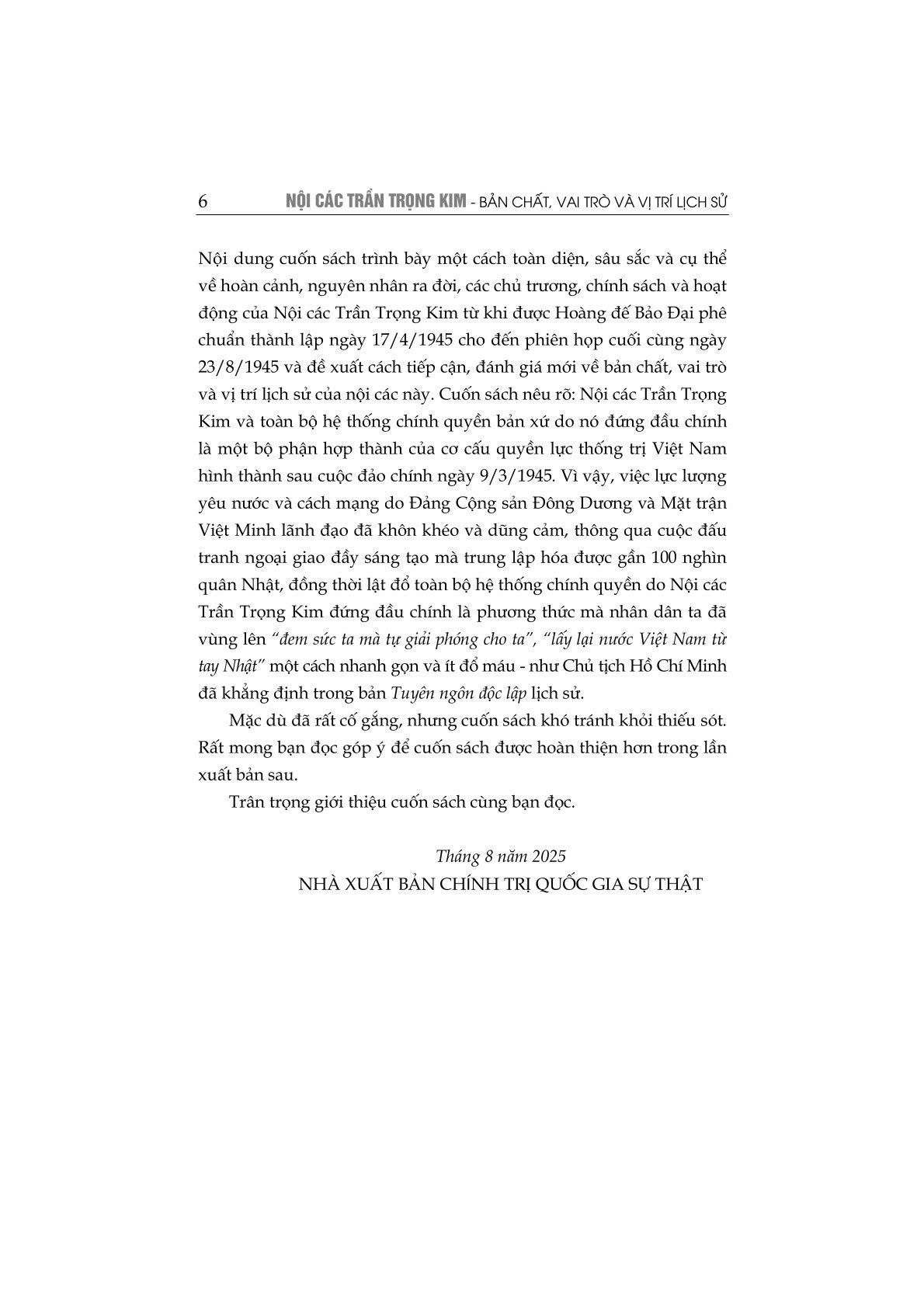 Trong loạt sách ra mắt kỷ niệm 80 năm Cách mạng Tháng Tám thành công (19/8/1945 - 19/8/2025) và Quốc khánh 2/9 (2/9/1945 - 2/9/2025), cuốn Nội các Trần Trọng Kim - Bản chất, vai trò và vị trí lịch sử của GS.TS. Phạm Hồng Tung, do Nhà xuất bản Chính trị quốc gia Sự thật xuất bản lần thứ tư, có chỉnh sửa, bổ sung gây chú ý bởi cách tiếp cận sắc bén, toàn diện và khách quan, nhiều chiều cạnh. Không chỉ dừng lại ở việc tái hiện bối cảnh lịch sử của một giai đoạn đầy biến động này, tác phẩm còn lý giải thuyết phục, khoa học và khẳng định vì sao cuộc Tổng khởi nghĩa tháng Tám năm 1945 thành công nhanh gọn, thắng lợi vẻ vang.