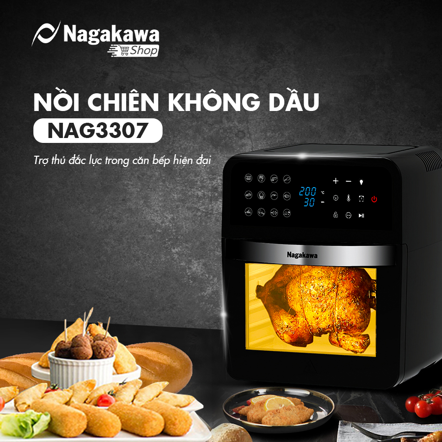 Nồi chiên không dầu Nagakawa NAG3307 bao gồm 12 chương trình nấu cài đặt sẵn, bao gồm: Làm nóng | Khoai tây chiên | Bánh mì | Cánh gà | Thịt bò | Bánh ngọt | Tôm | Cá | Pizza | Rau | Gà quay | Gà nướng
