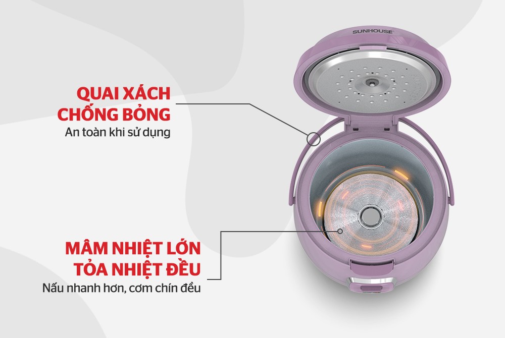 Nồi cơm điện SUNHOUSE 1.8L SHD8602 KIỂU DÁNG TRẺ TRUNG – TIỆN DỤNG VÀ AN TOÀN Thiết kế đơn giản, trẻ trung và an toàn Nồi cơm điện SUNHOUSE 1.8L SHD8602 được thiết kế với