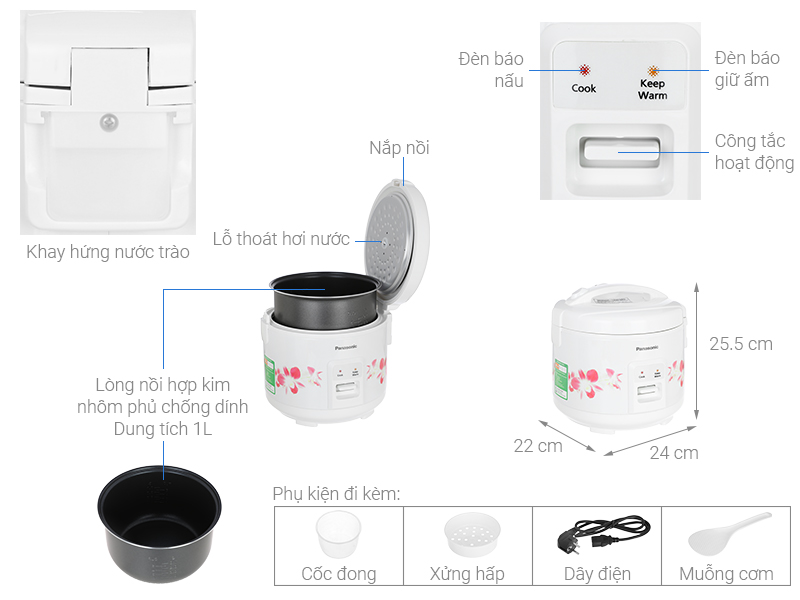 Đặc điểm nổi bật Dung tích 1 lít thích hợp cho gia đình 2 - 4 thành viên Thiết kế nhỏ gọn hiện đại nâng tầm không gian bếp Nồi cơm điện với hệ thống