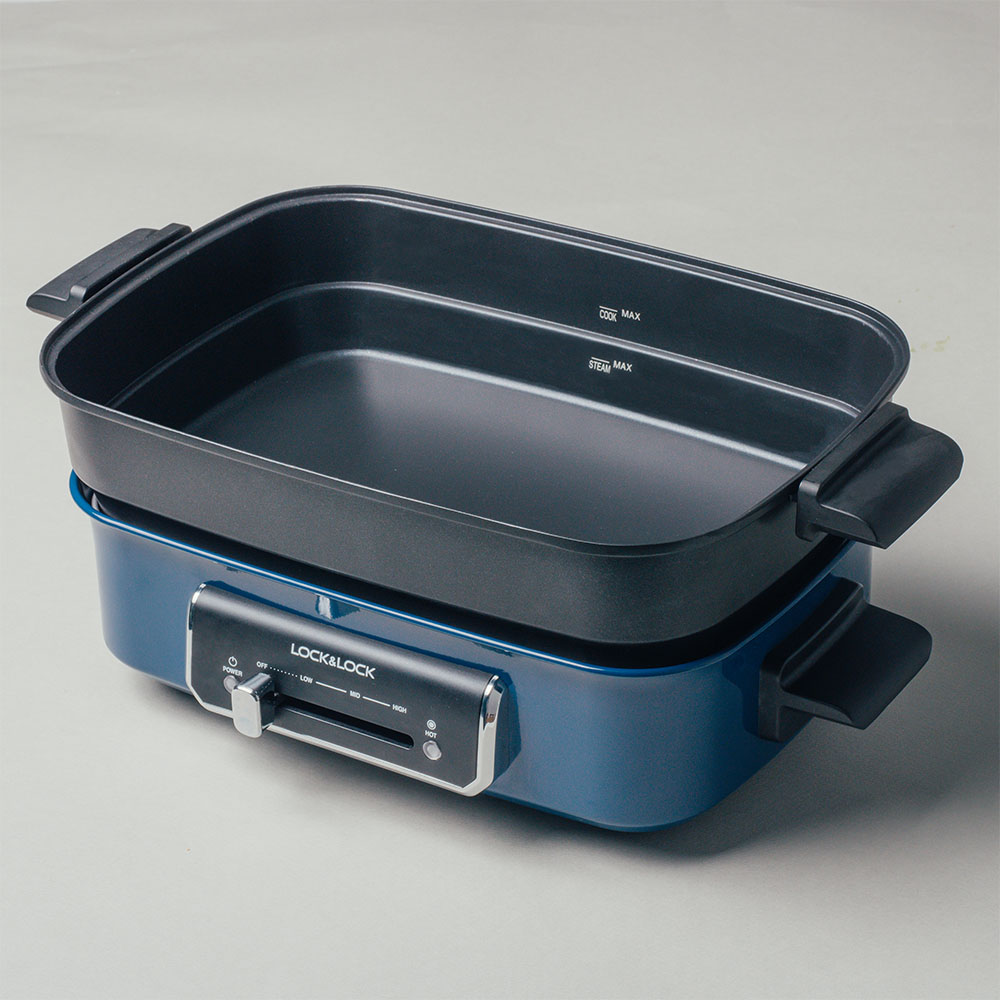 Nồi điện đa năng Lock&Lock 2.5L EJG556, Hàng chính hãng, 3trong1 nướng, hấp, nấu, Làm nóng nhanh, Dễ chỉnh nhiệt-JoyMall THÔNG TIN SẢN PHẨM Chất liệu: Cold tie plate, Tấm nhôm, Nhôm, PET Màu: xanh navy Dung tích: 2,5L Sản xuất tại: Trung Quốc Xuất xứ thương hiệu: Hàn Quốc Kích thước nồi: 415x253x229mm TÍNH NĂNG NỔI BẬT