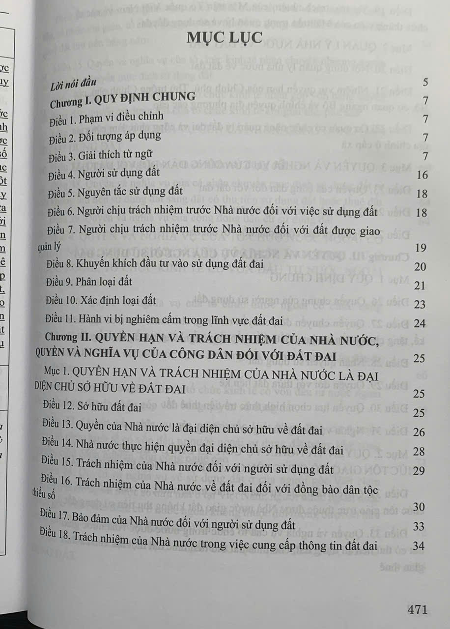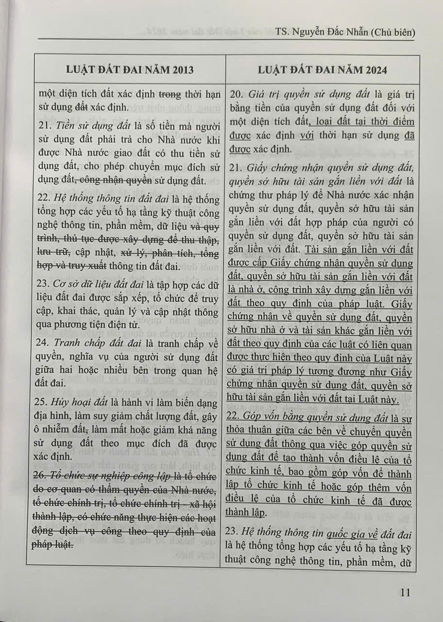 Nội dung kế thừa, bổ sung, đổi mới của Luật Đất đai năm 2024 so với Luật Đất đai năm 2013 Tác giả: TS. Nguyễn Đắc Nhẫn (chủ biên) Nhà xuất bản: Tư Pháp Công ty phát hành: Nhà xuất bản Tư Pháp Phát hành: 9.2024 Khổ sách: 19*27cm Số trang: 486 Giá bìa: 240.000 đ   Luật Đất đai là đạo luật lớn, có mối quan hệ chặt chẽ với nhiều luật khác; có ý nghĩa và tầm quan trọng đặc biệt trong đời sống chính trị, kinh tế - xã hội, quốc phòng, an ninh và bảo vệ môi trường; có tác động sâu rộng đến các tầng lớp Nhân dân và cộng đồng doanh nghiệp. Chính vì vậy, Hội nghị lần thứ Năm Ban Chấp hành Trung ương Đảng khóa XIII đã ban hành Nghị quyết số 18-NQ/TW ngày 16/6/2022 về “Tiếp tục đổi mới, hoàn thiện thể chế, chính sách, nâng cao hiệu lực, hiệu quả quản lý và sử dụng đất, tạo động lực đưa nước ta trở thành nước phát triển có thu nhập cao”. Nghị quyết số 18-NQ/TW đề ra 05 quan điểm, 03 mục tiêu, 06 nhóm giải pháp và 08 nhóm chính sách lớn để hoàn thiện pháp luật về đất đai. Đây là cơ sở chính trị quan trọng, là kim chỉ nam, là chủ trương, định hướng chính sách cơ bản để xây dựng, hoàn thiện Luật Đất đai lần này (Luật Đất đai năm 2024). Trong quá trình xây dựng và hoàn thiện Luật Đất đai năm 2024, Bộ Tài nguyên và Môi trường cùng với các cơ quan của Chính phủ, các cơ quan của Quốc hội và các cơ quan, tổ chức hữu quan đã chuẩn bị rất công phu, kỹ lưỡng với tinh thần trách nhiệm cao; tổ chức nghiên cứu, phân tích để tiếp thu những ý kiến phù hợp của Nhân dân, của các cơ quan, tổ chức, chuyên gia, nhà khoa học. Đặc biệt, dự thảo Luật Đất đai đã được trình Quốc hội khóa XV thảo luận, cho ý kiến tại 4 kỳ họp và tại kỳ họp bất thường lần thứ 5, ngày 18/01/2024, Quốc hội khóa XV đã biểu quyết thông qua Luật Đất đai năm 2024 (Luật số 31/2024/QH15). Đây là sự kiện quan trọng đánh dấu những đổi mới về chính sách, pháp luật đất đai đáp ứng yêu cầu phát triển kinh tế - xã hội trong thời kỳ đẩy mạnh công nghiệp hóa, hiện đại hóa đất nước, phát triển nền kinh tế thị trường định hướng xã hội chủ nghĩa, hội nhập quốc tế sâu rộng, bảo đảm giữ vững ổn định chính trị - xã hội của đất nước. Luật Đất đai năm 2024 gồm 260 điều, được hoàn thiện trên cơ sở kế thừa, sửa đổi, bổ sung các điều, khoản của Luật Đất đai năm 2013; đồng thời bổ sung các điều, khoản mới từ việc nghiên cứu luật hóa các quy định pháp luật về đất đai trong nghị định của Chính phủ và thể chế thành luật các vấn đề đã “chín”, đã rõ, đã được thí điểm thực hiện và được thực tế chứng minh là đúng, là phù hợp. Để thuận tiện trong quá trình theo dõi, nghiên cứu, triển khai thi hành Luật, cuốn sách “Nội dung kế thừa, bổ sung, đổi mới của Luật Đất đai năm 2024 so với Luật Đất đai năm 2013” được trình bày như sau: - Các nội dung kế thừa Luật Đất đai năm 2013 được thể hiện bằng kiểu chữ binh thường (Normal); - Các nội dung của Luật Đất đai năm 2013 bị lược bỏ, không quy định trong Luật Đất đai năm 2024 được thể hiện bằng kiểu chữ bình thường và có thêm gạch đè (Strikethrough); - Các nội dung Luật Đất đai năm 2024 sửa đổi, bổ sung so với Luật Đất đai năm 2013 được thể hiện bằng kiểu chữ bình thường và có thêm gạch chân (Underline). Luật Đất đai năm 2024 có 16 chương, tăng 02 chương so với Luật Đất đai năm 2013 do bổ sung chương Phát triển, quản lý và khai thác quỹ đất (Chương VIII), tách riêng chương Thu hồi đất, trưng dụng đất (Chương VI) và Bồi thường, hỗ trợ, tái định cư khi Nhà nước thu hồi đất (Chương VII); thứ tự sắp xếp các chương của Luật Đất đai năm 2024 không giữ nguyên như Luật Đất đai năm 2013 mà được sắp xếp, bố cục theo trình tự thực hiện các nhiệm vụ quản lý nhà nước về đất đai để tiện theo dõi, tra cứu và thuận lợi hơn trong triển khai thi hành Luật nên thứ tự các điều luật của Luật Đất đai năm 2024 và Luật Đất đai năm 2013 không song hành với nhau. Chính vì vậy, để tra cứu và thực thi Luật Đất đai năm 2024 được thuận lợi, cuốn sách này thiết kế 02 cột Luật (cột Luật Đất đai năm 201