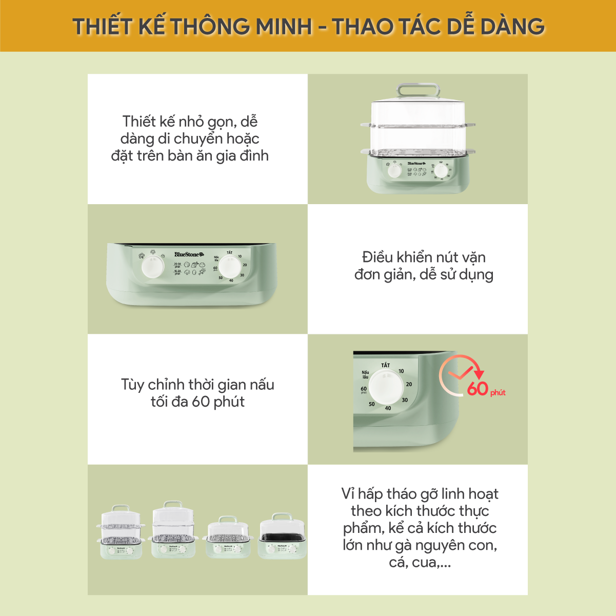 Nồi hấp đa năng Bluestone MPB-7235 - Công suất: 1500W - Dung tích xửng hấp: 12L - Dung tích lòng nồi: 3L - Xửng hấp 2 tầng có thể hấp nhiều món cùng lúc -