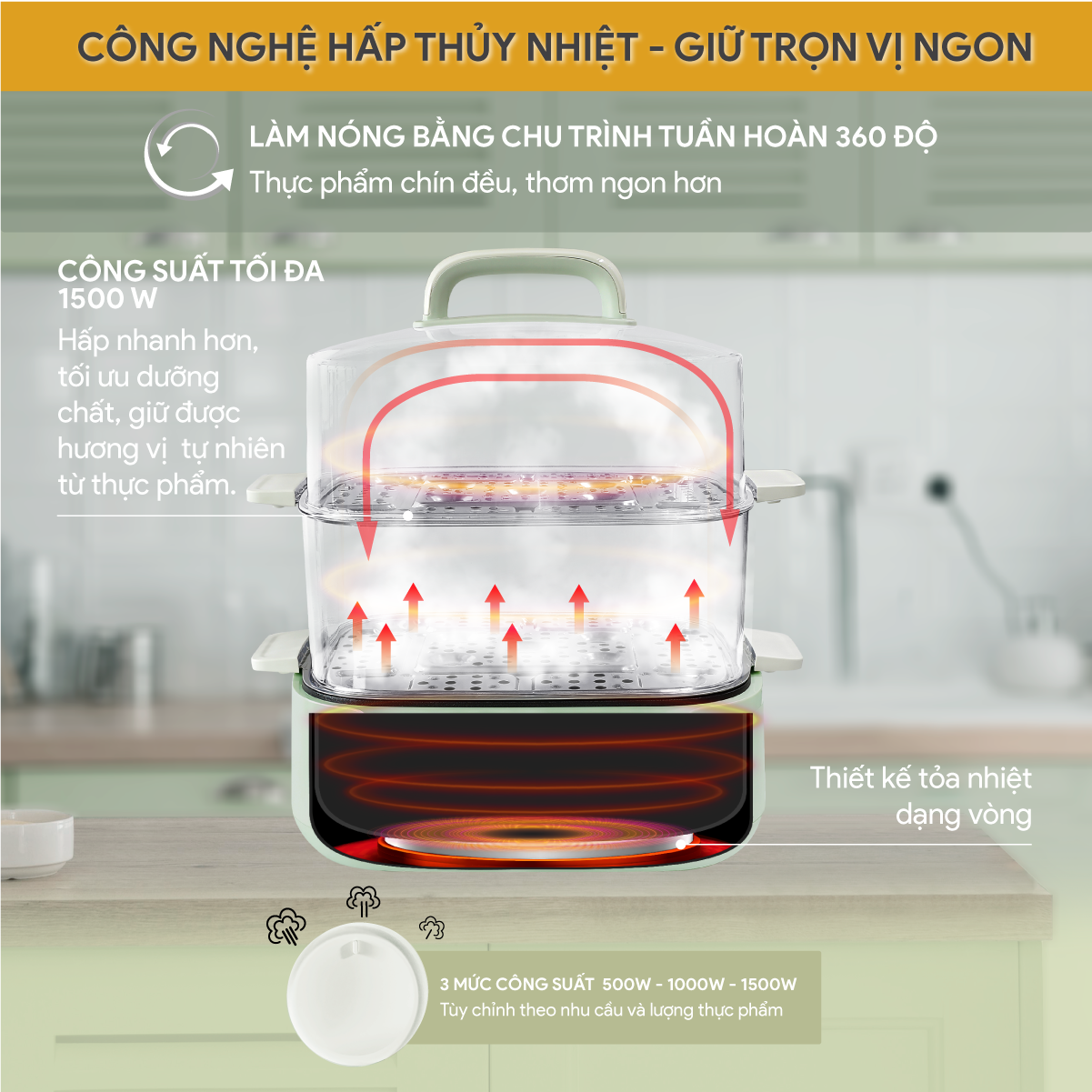 Thông tin sản phẩm Khay hấp dạng vuông hai tầng - dung tích 6L: hấp được nhiều thức ăn hơn Hẹn giờ 60 phút: không phải bận tâm canh thời gian hấp Tỏa nhiệt dạng vòng: món ăn