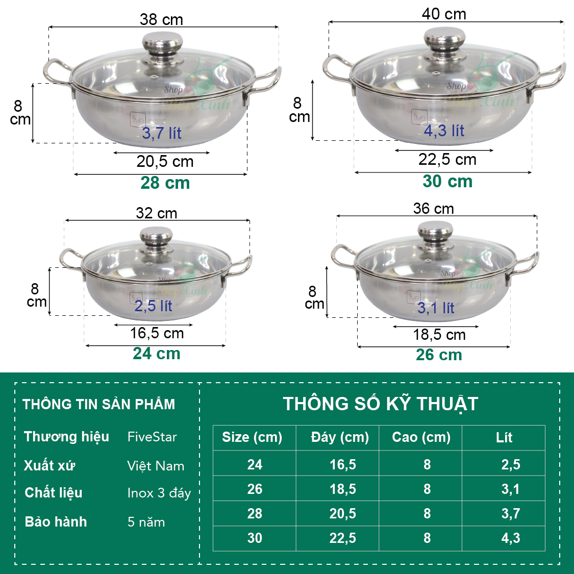 Nồi lẩu um xào inox 430 bếp từ 3 đáy Fivestar nắp kính ( 24cm / 26cm / 28cm ) NỒI LẨU INOX 32CM : – Thiết kế theo công nghệ hiện đại, kiểu dáng