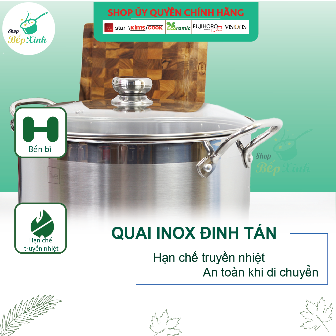 Đặc điểm nổi bật Cấu tạo 3 đáy truyền nhiệt nhanh, giữ nhiệt tốt, hạn chế cháy khét thực phẩm. Đường kính 30cm có xửng hấp nấu ăn đa năng: luộc gà, nấu canh, hấp Chất