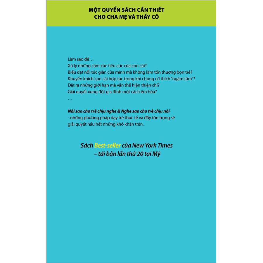- Giải quyết xung đột gia đình một cách êm hòa? Nói Sao Cho Trẻ Chịu Nghe & Nghe Sao Cho Trẻ Chịu Nói chứa đựng những phương pháp dạy trẻ thực tế và đầy tôn trọng sẽ giúp giải quyết hầu hết những khó khăn trên, các bậc phụ huynh không còn phải vật lộn với đám nhóc nhà mình nữa mà vẫn đạt được hiệu quả giáo dục hoàn hảo. Đây là bí kíp dành cho phụ huynh cải thiện mối quan hệ với con trẻ, xây dựng cuộc sống gia đình hòa thuận và hạnh phúc.