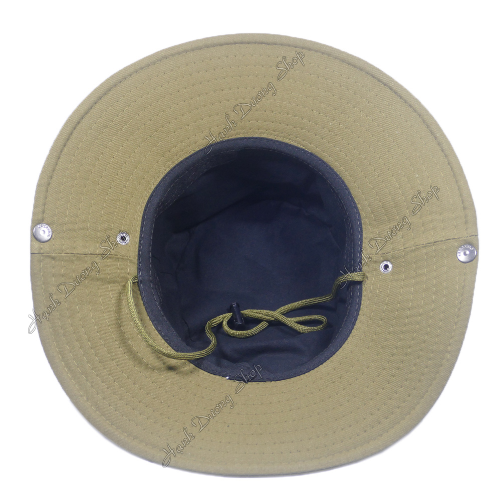 Vải Kaki dày dặn nhưng không nóng vì là 100%cotton. Có dây đeo không lo gió bay. Nút bấm kim loại 2 bên vành nón để bẻ lên cho ngầu luôn. Shop nhận thêu logo
