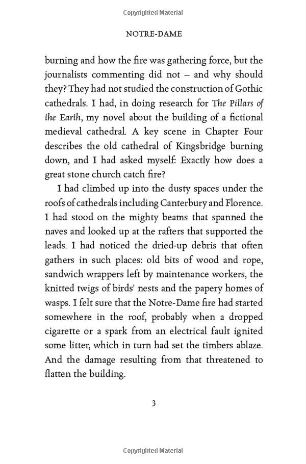 ‘Two days after Notre Dame burned, I flew to Paris to appear on the TV programme La Grande Librairie for a discussion about cathedrals. The following morning I had breakfast at the Hotel Bristol with my French publisher and she asked me to write a short book about Notre Dame and what it means to all of us. She said she would donate the publisher’s profits to the rebuilding fund and, if I wished, I could do the same with my royalties. Yes, I said; of course, I’d love to.’