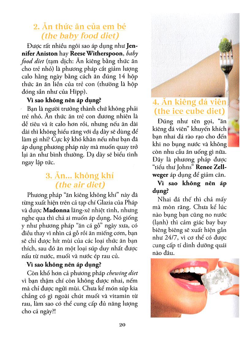 Ăn ngon hay trông “ngon” sẽ không còn là câu hỏi khiến nàng phải “ong thủ” nữa bởi với cuốn cẩm nang kì diệu này, nàng có thể vừa ăn ngon, vừa có một phần nhìn vẫn quyến rũ và vừa vặn vô cùng. Tất cả là bởi những bí kíp ăn uống sao cho đúng chuẩn, những “luật lệ” của một chế độ dinh dưỡng hợp lí và một lối sống lành mạnh cùng những gợi ý tập tành vô cùng hấp dẫn bởi tập mà như không tập!