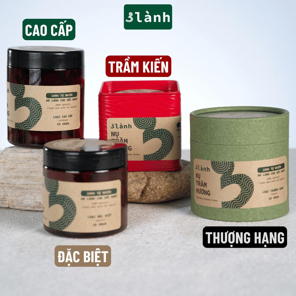 Mua tại TiktokThông tin sản phẩm Nụ Trầm Hương Sạch Tự Nhiên Không Hóa Chất thương hiệu 3 Lành Xuất xứ nụ trầm hương: Pleiku, Việt Nam Phân loại theo tuổi trầm Đặc biệt: Được làm từ bột vụn trầm tuổi khoảng 7-12 năm, lượng tinh dầu vừa phải, và kết dính keo bời lời. Cao Cấp: Được làm từ bột trầm tuổi trầm 12-15 năm Thượng hạng: Được làm từ bột vụn trầm tóc kiến núi tuổi trầm trên 20 năm Trầm Kiến: được làm từ trầm kiến tự nhiên, mặt cắt trầm có lổ kiến, vân nhựa rõ. Thời gian cháy: 30-35 phút / nụ Thời gian lưu hương: 2-3 tiếng Phân loại theo trọng lượng hộp: 50gr / hộp: ~ 21-24 nụ Công dụng Nụ Trầm Hương sạch, tự nhiên, không hóa chất 3 Lành Dùng trong nhà và thờ cúng:
