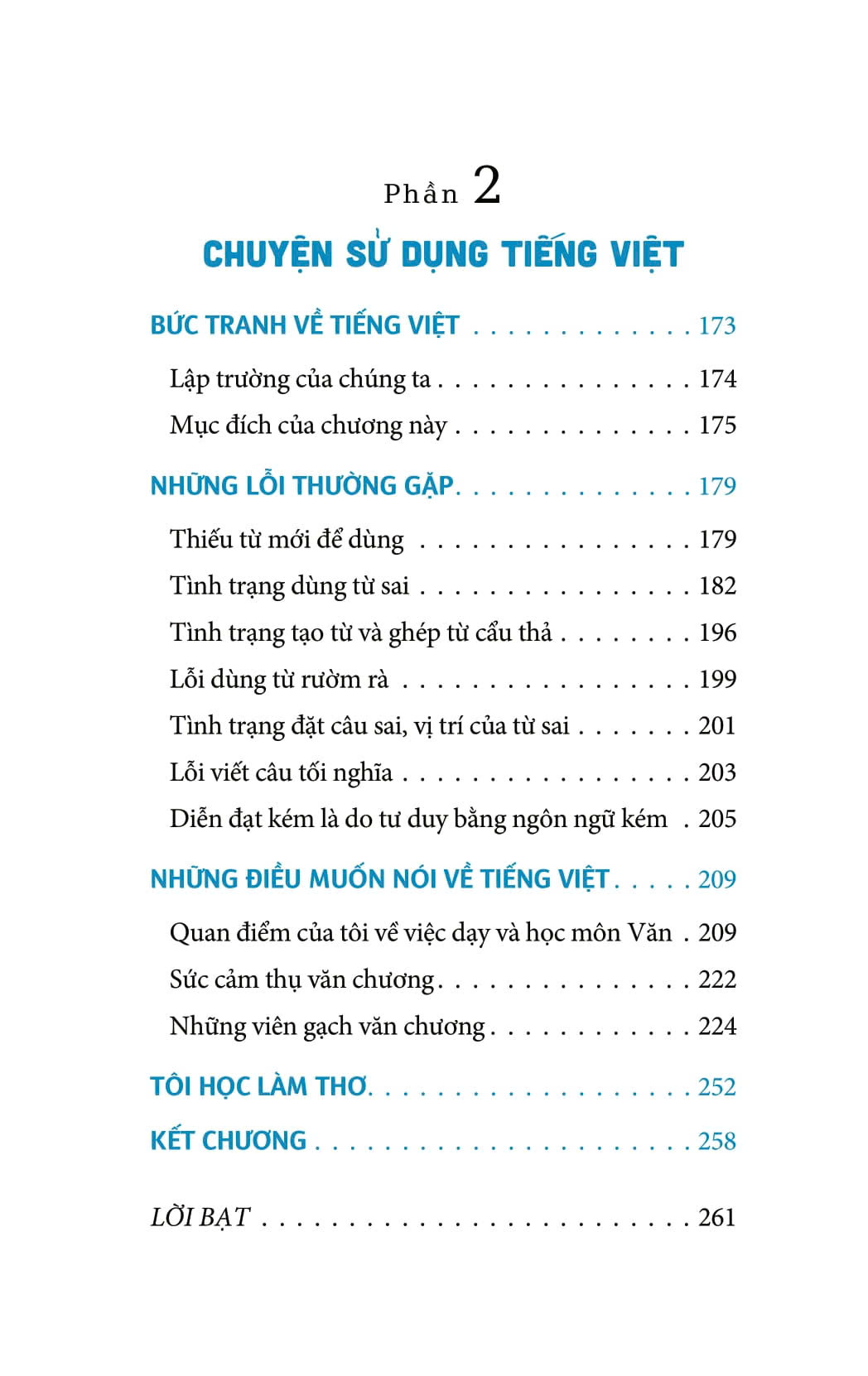 Tiếng Việt, với tác giả, không chỉ là một ngôn ngữ giao tiếp mà còn là bản sắc văn hóa, là linh hồn của dân tộc. Phần này đề cập đến những lỗi phổ biến khi sử dụng tiếng Việt, từ việc thiếu từ vựng, ghép từ cẩu thả, đến việc đặt câu tối nghĩa. Đồng thời, tác giả cũng chia sẻ quan điểm của mình về cách dạy và học môn Văn, nhấn mạnh tầm quan trọng của việc giữ gìn sự trong sáng và chuẩn mực của tiếng Việt.