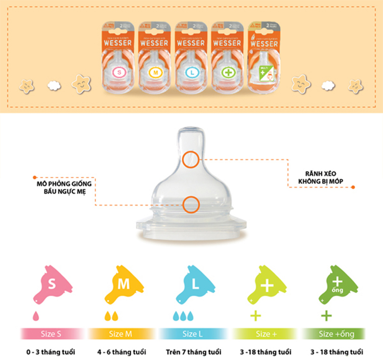 - Với thiết kế dựa trên quá trình nhiều năm quan sát và nghiên cứu cử động bú mẹ của bé, núm ty silicon vừa giúp bé bú sữa dễ dàng, vừa hỗ trợ cho sự phát triển tự nhiên của cơ hàm, răng và cấu trúc xương. Sản phẩm của thương hiệu Wesser gắn liền với các sản phẩm chăm sóc cho bé từ những ngày tháng đầu đời. Đặc điểm nổi bật