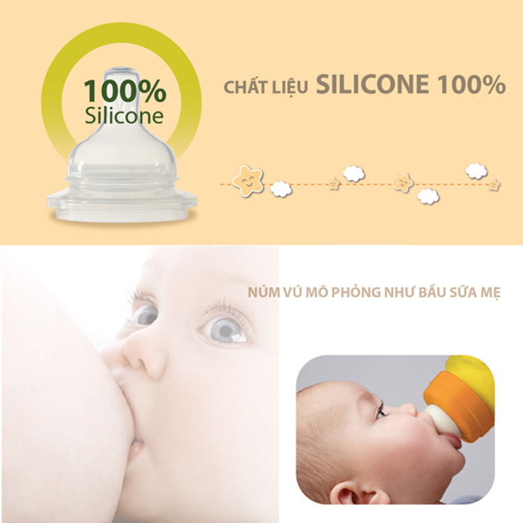 - Thiết kế độc đáo giúp núm vú có độ đàn hồi vượt trội, siêu mềm mại, bầu rộng giống vú mẹ