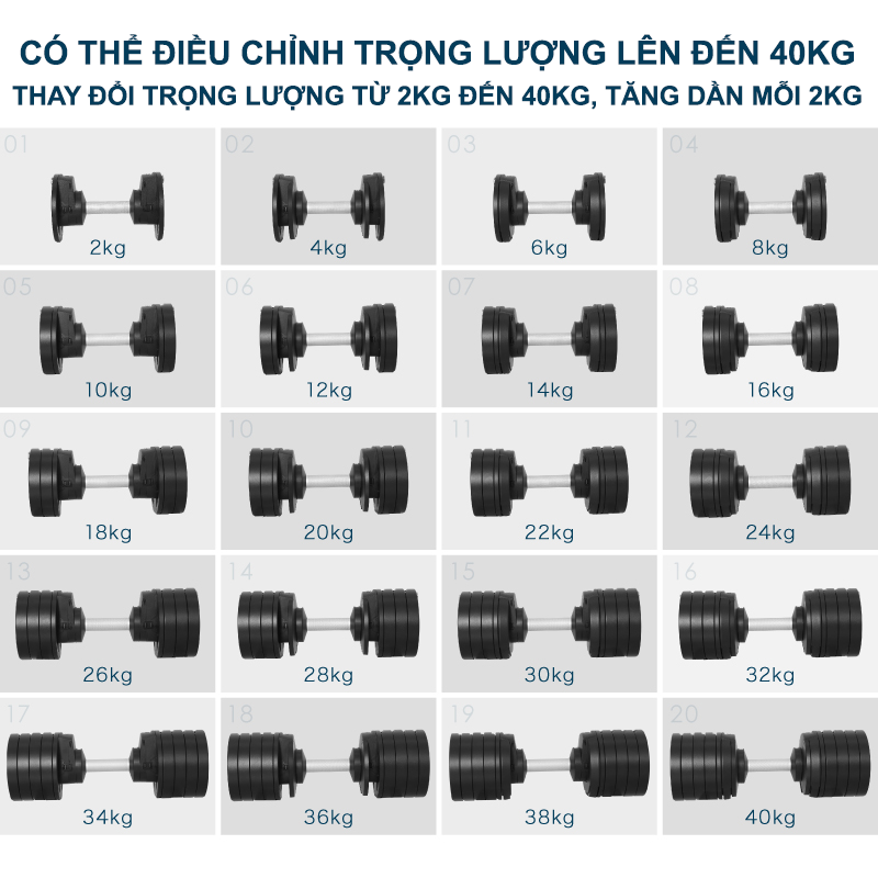 Mô tả chi tiết sản phẩm: Bộ Tạ Tập Gym Tại Nhà 40kg - Bộ Tạ Tay Đa Năng Điều Chỉnh Cân Nặng - Kết Hợp Tạ Tay, Tạ Đẩy, Tạ Đòn - Phân loại