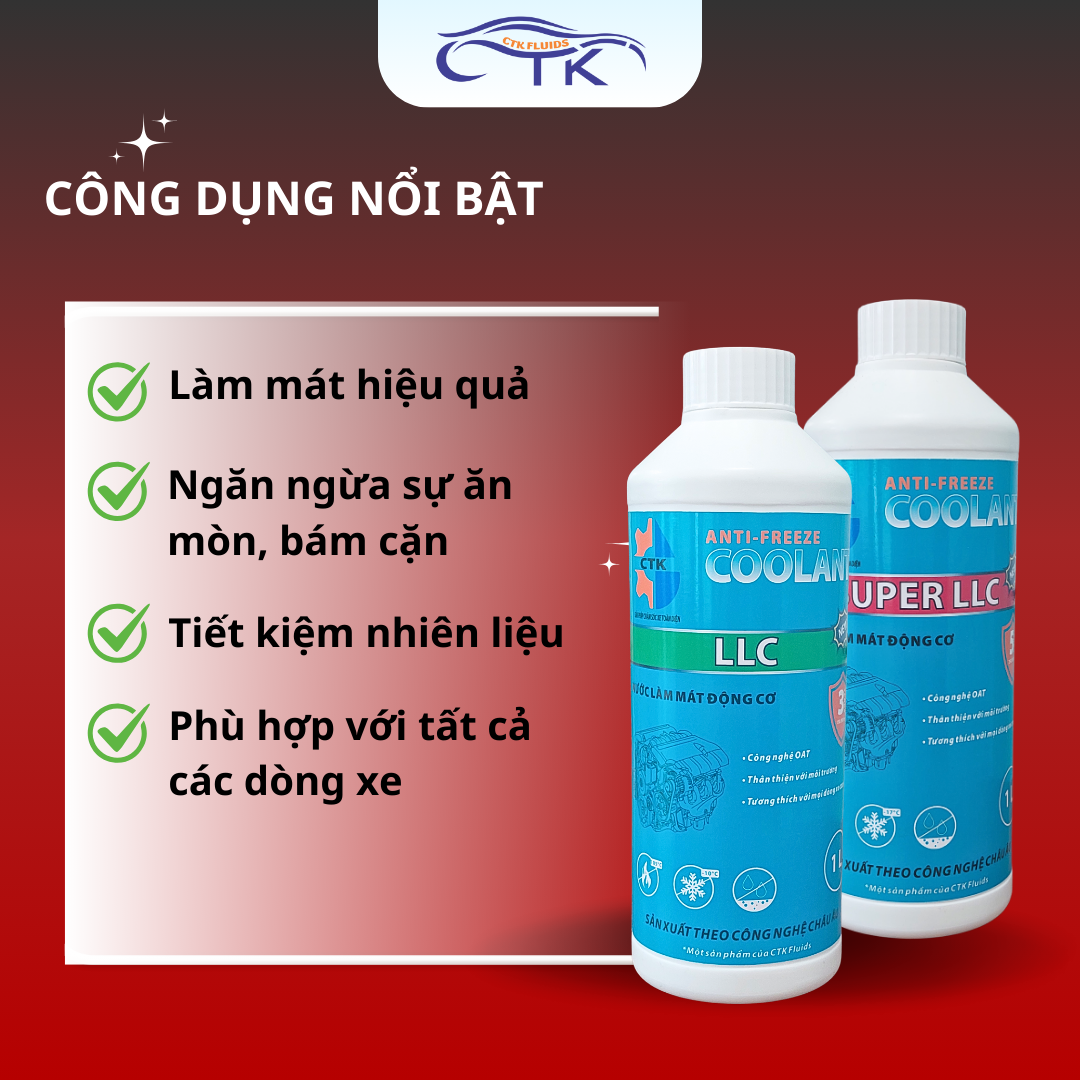 CTKF- CHUYÊN CUNG CẤP SẢN PHẨM CHO CÁC HÃNG XE LỚN VINFAST, HYUNDAI, FORD, ISUZU   NƯỚC LÀM MÁT ĐỘNG CƠ Ô TÔ MÀU XANH CTK Nước Làm Mát Động Cơ Ô Tô CTK Là Một Sản Phẩm Của CTK FLUILDS, Đảm Bảo Chính Hãng, Uy Tín, Chất Lượng  Thông Số Kỹ Thuật: - Loại: Nước làm mát động cơ ô tô màu xanh CTK LLC Coolant - Dung tích: 1 lít hoặc 4 lít - Thành phần: Ethylene Glycol 20%, Nước Dl, Chất phụ gia ức chế ăn mòn - Công nghệ phụ gia: OAT - Vòng đời: 150.000 Km/ 3 năm - Dòng xe tương thích: Tất cả các dòng xe: Ford, HyunDai, Isuzu, Vinfast - Điểm đóng băng, Điểm sôi: -8 độ C-> -10 độ C/ 103 độ C-> 105 độ C - Dòng xe tương thích: Tất cả dòng xe: Ford, HyunDai, Isuzu, Vinfast,... - Khuyến Nghị các khu vực nhiệt đới (Đông Nam Á, Trung Mỹ, Trung Phi) THÔNG SỐ KĨ THUẬT ĐẶC ĐIỂM NỔI BẬT - Chất lượng vượt trội: Công thức độc quyền giúp làm mát hiệu quả, ổn định nhiệt độ