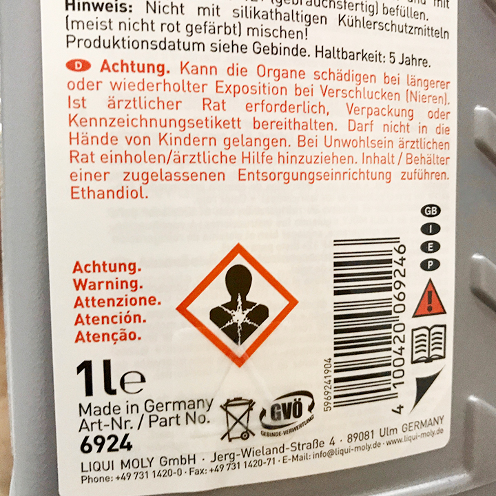 Thông Tin Kỹ Thuật: -Điểm cháy: > 115°C -Màu : Đỏ -Tỷ trọng ở 20 °C : 1,053 g/cm3 -Thành phần : Ethylene glycol và chất chống rỉ sét -Bảo vệ chống đông và quá nhiệt : -20 to +104 °C