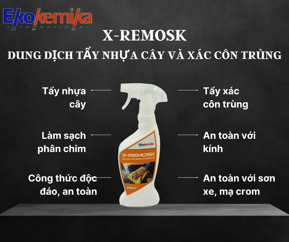 X-REMOSK là sản phẩm tẩy nhựa cây, phân chim & xác côn trùng chuyên dụng, với công thức độc đáo X-Remosk giúp dễ dàng làm sạch nhựa cây và xác côn trùng cứng đầu trên bề mặt kính, sơn, crom và nhựa mà không làm ảnh hưởng đến bề mặt tiếp xúc.