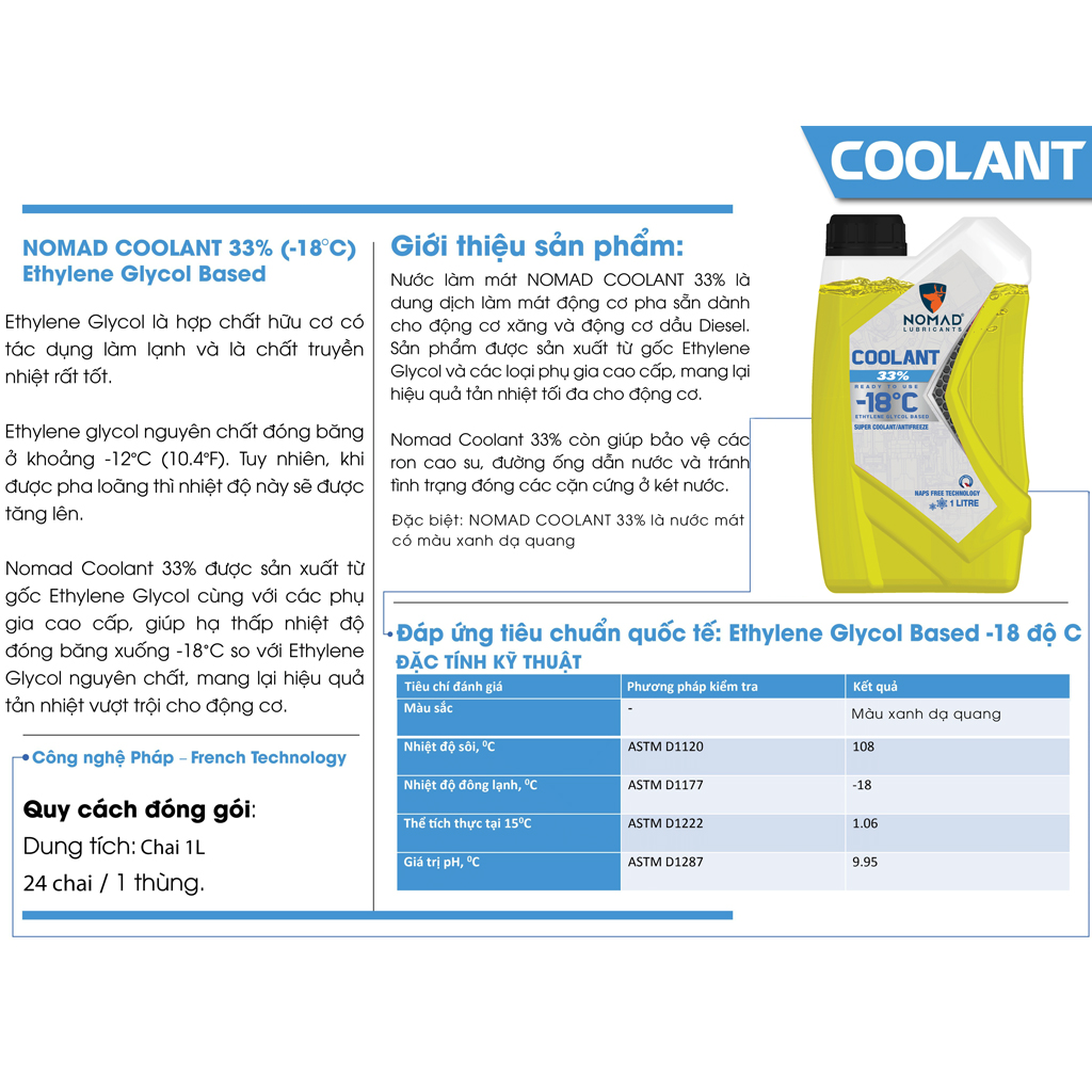 Nước làm mát NOMAD COOLANT 33% (-180C) được sản xuất từ gốc Ethylene Glycol cùng các phụ gia cao cấp, giúp nâng cao khả năng tản nhiệt cho động cơ và hạ thấp nhiệt độ đóng băng xuống -180C so với Ethylene Glycol nguyên chất (nhiệt độ đóng băng tại -120C). Đặc biệt, dung dịch làm mát NOMAD có chứa phụ gia làm giảm sự ăn mòn khi động cơ hoạt động và chống đóng cặn két nước.