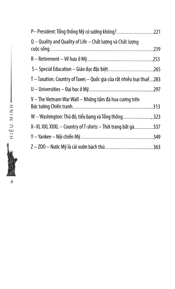 Nước Mỹ trong quan sát của tác giả Hiệu Minh không chỉ là những điều to lớn, vĩ đại khiến nhân loại phải công nhận như là quốc gia đầu tiên có người đặt chân lên Mặt trăng, quốc gia của những giải Nobel hay đất nước công nghệ số 1 mà đó còn là đất nước với “A-American Dream tưởng là giấc mơ Mỹ nhưng chỉ là giấc mơ trong mắt trẻ trâu với những trải nghiệm thật. Tương tự, tác giả nhìn ra Hoa Kỳ là cái Z-Zoo vì môi sinh được giữ gìn. S-Special Education nói về người cha đưa hai con nhỏ tới Mỹ, một con mắc chút tự kỷ, được nền giáo dục Mỹ yêu thương và hôm nay đưa con tới bến đậu của American Dream…”. Những chuyện yêu đương, hôn nhân, việc học, việc làm, việc kiếm tiền để sống ở quốc gia dân chủ thì rất dân chủ nhưng cũng vô cùng khắc nghiệt để tồn tại với những khoản nợ, những vụn vặt thuế khóa, rồi chuyện đến Tổng thống cũng phải bán nhà để chữa bệnh cho con… có thể sẽ khá bất ngờ với nhiều người.