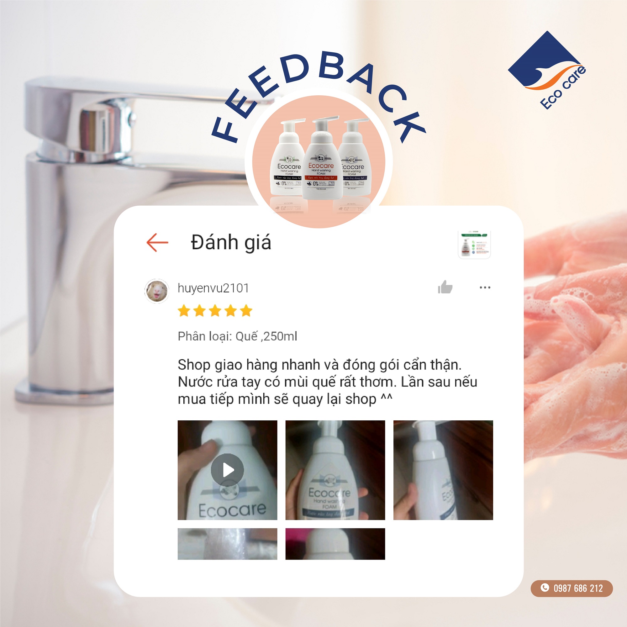 THÔNG ĐIỆP TỪ NHÀ SẢN XUẤT ECOCARE: - Trước tiên, Công ty Ecocare xin cảm ơn Quý Khách hàng đã tin tưởng lựa chọn sản phẩmNước rửa tay tạo bọt Hữu cơ 250ml, Nước