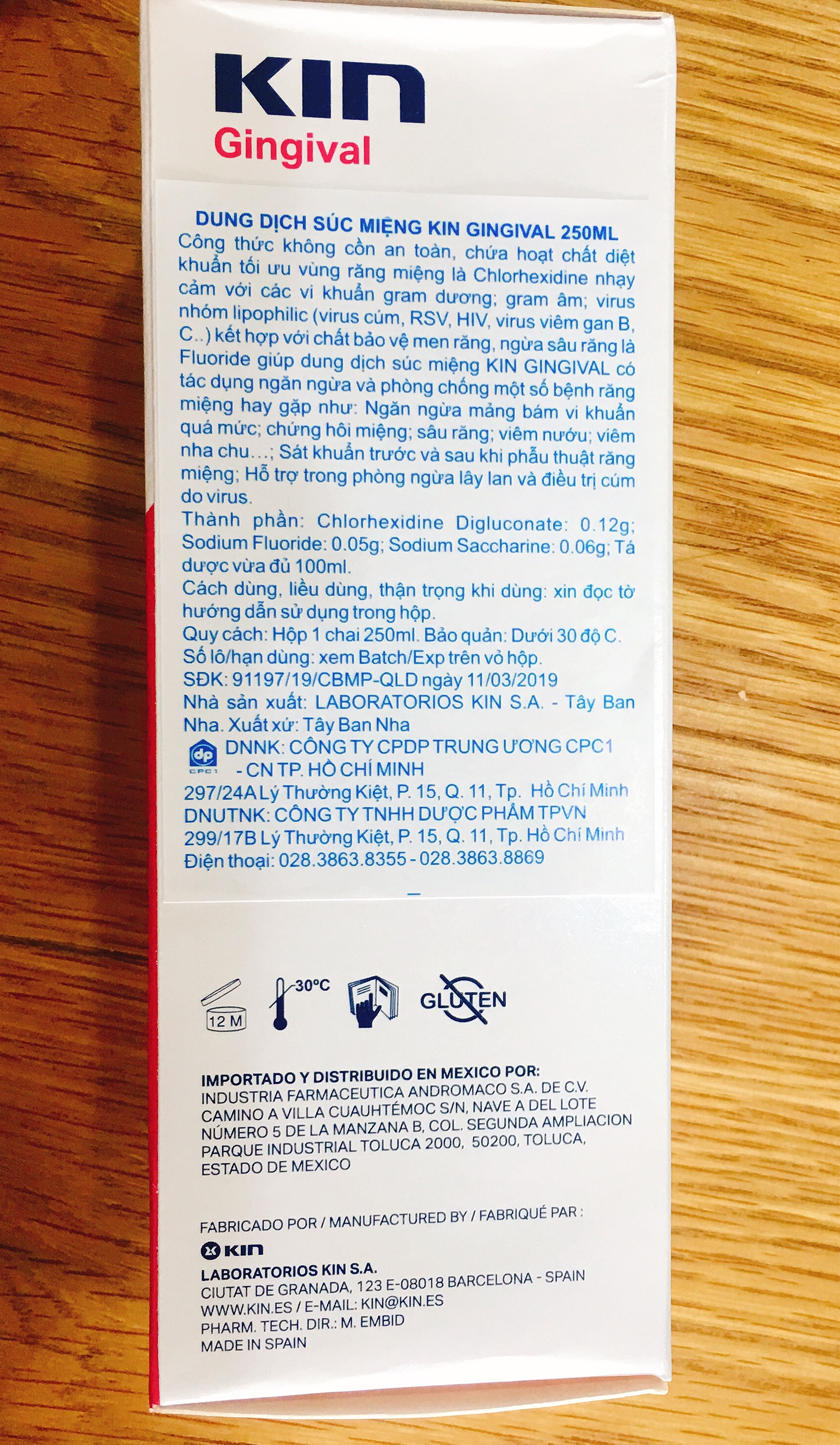 NƯỚC SÚC MIỆNG KIN GINGIVAL NGĂN NGỪA VÀ HỖ TRỢ ĐIỀU TRỊ VIÊM NƯỚU NHỜ VÀO THÀNH PHẦN CHÍNH LÀ CHẤT KHÁNG KHUẨN CHX 0.12% ĐỒNG THỜI CHỨA FLUORIDE GIÚP TÁI KHOÁNG HÓA MEN RĂNG VÀ NGỪA SÂU RĂNG VƯỢT TRỘI. VỚI KIN GINGIVAL, VIÊM NƯỚU, SÂU RĂNG, HÔI MIỆNG DỄ DÀNG BỊ ĐÁNH BAY.   KIN LABORATORIOS S,A. là một thương hiệu hàng đầu Châu Âu về sản phẩm chăm sóc răng miệng. Trong nhiều năm trở lại đây, KIN đã khẳng định thương hiệu của mình trên thị trường quốc tế với sự có mặt của nhãn hàng KIN tại trên 60 quốc gia trên thế giới. Sản phẩm của KIN phong phú, đa dạng với hơn 70 sản phẩm chất lượng cao hỗ trợ điều trị tốt nhiều vấn đề răng miệng thường gặp như nha chu, viêm nướu, sâu ră Nước súc miệng ngừa nha chu viêm nướu KIN Gingival có thể được ví như một chuyên gia hàng đầu đến từ Châu Âu hỗ trợ điều trị viêm nướu và viêm nha chu triệt để.  NƯỚC SÚC MIỆNG KIN GINGIVAL NGĂN NGỪA VIÊM NƯỚU BẰNG CÁCH NÀO? Chlorhexidine Digluconate trong nước súc miệng KIN Gingival là một hoạt chất kháng khuẩn phổ rộng, nhạy cảm với hầu hết các vi khuẩn trú ngụ trong khoang miệng. Chlorhexidine đã được chứng minh có khả năng ngăn chặn sự hình thành các mảng bám trên răng giúp ngừa viêm nướu, viêm nha chu một cách hiệu quả. Sản phẩm Kin Gingival có khả năng tiêu diệt vi khuẩn gây hôi miệng, mang lại hơi thở thơm mát mỗi ngày. Với hàm lượng Chlorhexidine vừa đủ sẽ không làm ảnh hưởng đến các mô mềm niêm mạc miệng. NƯỚC SÚC MIỆNG KIN GINGIVAL CÒN CÓ NHỮNG ĐIỂM CỘNG NÀO? Ngoài thành phần chất kháng khuẩn, KIN Gingival còn chứa Fluoride Sodium giúp tái khoáng hóa men răng, ngăn ngừa sâu răng, bảo vệ men răng chống lại acid và kiềm hãm sự phát triển của vi khuẩn.  Đặc biệt, nước súc miệng KIN Gingival không chứa chất tạo bọt, không chứa cồn và các chất tẩy. Giúp nhanh lành vết loét, không gây kích ứng và khô niêm mạc miệng.   ĐỐI TƯỢNG SỬ DỤNG:
